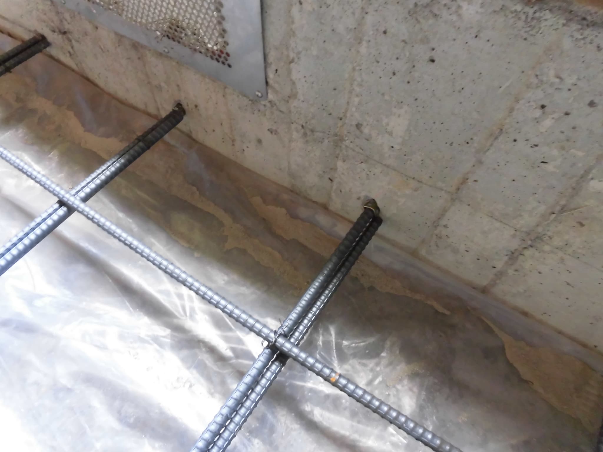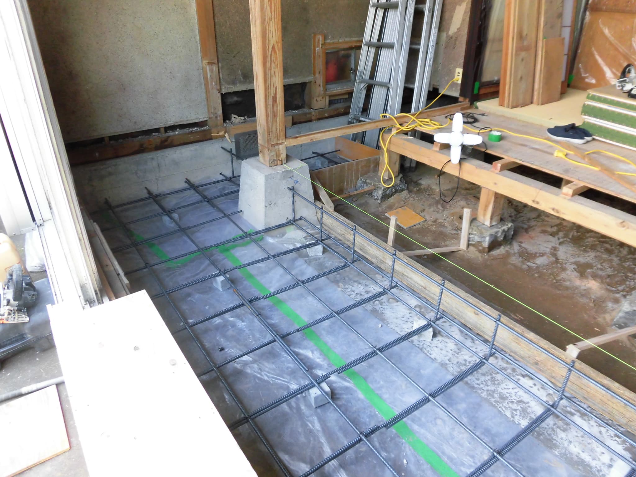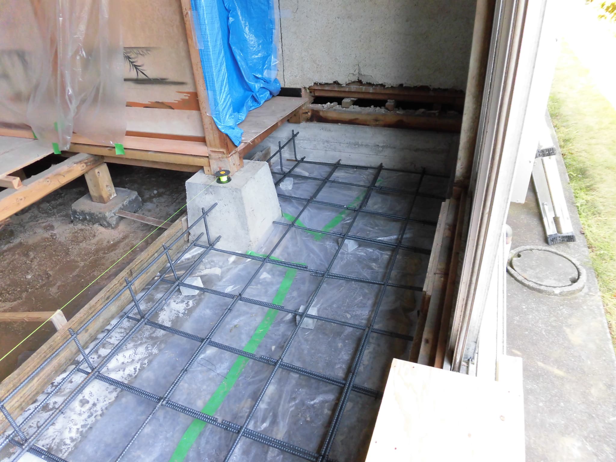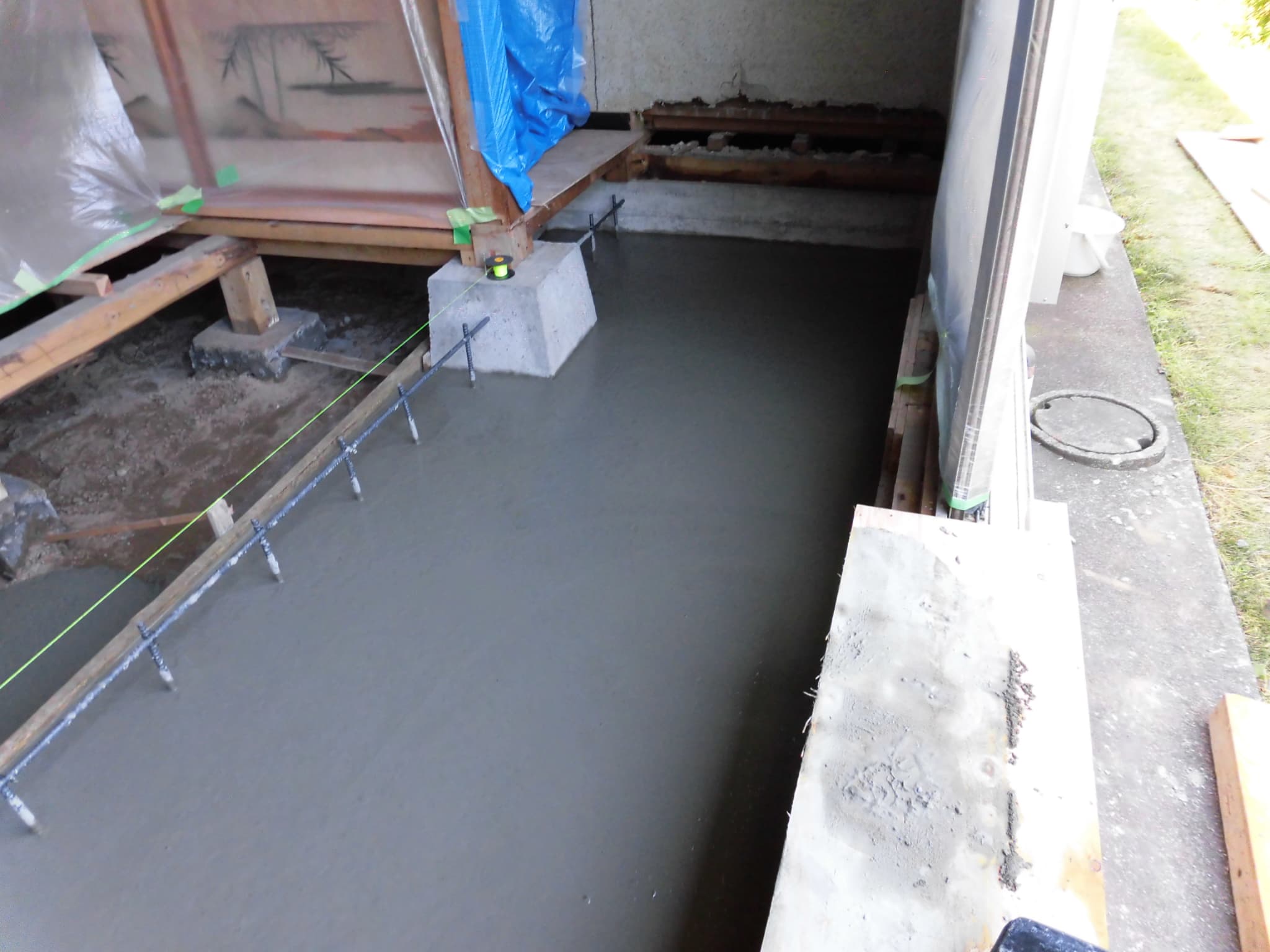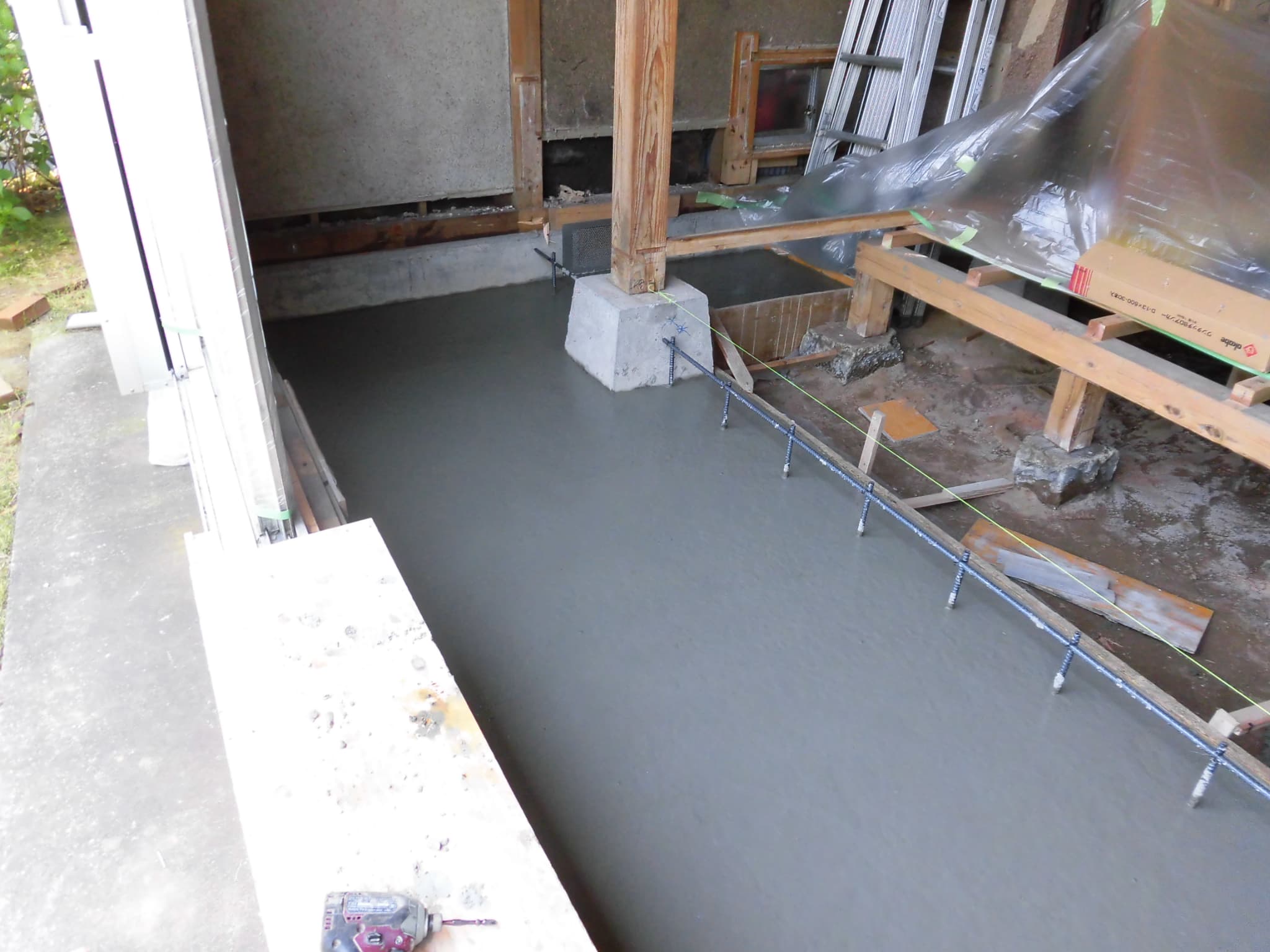 このとき重要なのは、単に鉄筋を立上り基礎などに孔をあけて差すだけではなく、「差筋アンカー」というものをつかって、差し込んだ鉄筋が抜けないような形態をとることが重要です。基礎を一体化させ、強固にすることが目的なのですから当然と言えば当然ですが、意外と差筋アンカーまで使わない改修をされる方います。以下の画像はコンクリートの土間部分が打ちあがったところです。