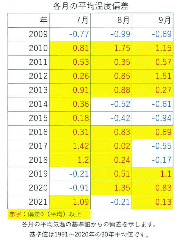 それだけではありません。まず、夏場7,8,9月の平均気温偏差を年毎に集計し、その偏差がプラス(0以上)になっている月をあらわします。