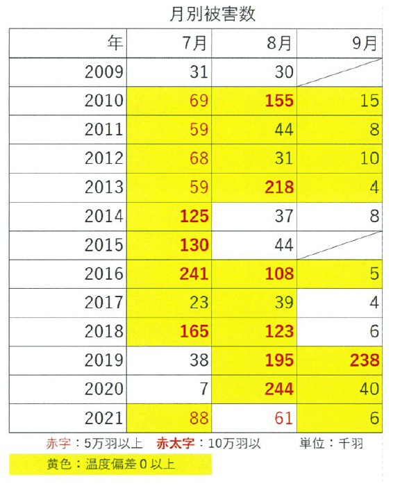 これに対して、「鶏」が暑さによって死んでしまったその被害数を重ねますと、偏差0以上の月はほぼ確実に鶏の被害が発生していることがわかります。