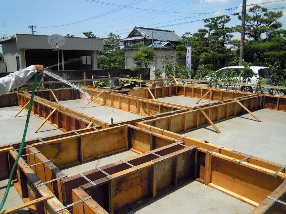 ということは、この季節。すぐに水分は蒸発していきますので、どんどん水を足していくいく必要があるわけです。当然、打設直後に水を入れるわけにはいきません。表面の水分が引き始めると、すぐに水をかけはじめないと、表面がバリバリに割れて、コンクリートの性能を発揮できません。これを水養生(湿潤養生)といいます。