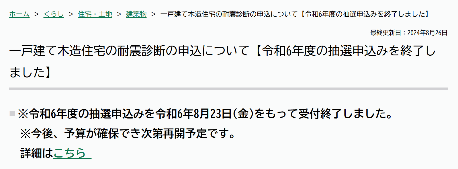 能登地震からはじまり、先日の宮崎県沖の地震による南海トラフ地震臨時情報(巨大地震注意)の発表など、地震災害への不安から耐震診断や補強プラン作成のご依頼は依然として多い状況です。ほぼ1週間に1軒程度は調査に伺っているような状況ですが、耐震診断及び補強プラン作成に関する補助事業への申し込みも、福井市では相変わらず抽選希望者が後を絶たず、先週、たまたま所用で行った福井市建築指導課に置かれている「抽選申し込み」の番号札が410番を超していたのにはビックリでした。そして8月23日には、令和6年度の当初予算で確保されていた分が終了し、今後の補正予算等の成立をまって補助事業再開となる見込みですが、まだ300軒以上の希望者がおられることが予想されますので、どのくらいの予算が組まれるかわかりませんが、今年度中に調査を終えることは難しいのでは?と思います。