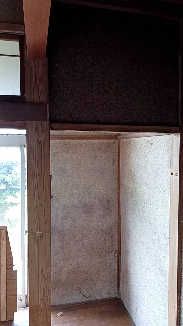 これは床の間の書院部分の壁を解体したあとの画像なんですが、1枚目の画像を見ると、なんとなくですが、向かって右側の柱が下がっているようにみえますよね?もちろん改修前からこの柱が「下がっている」ようにみえるので、その原因として、