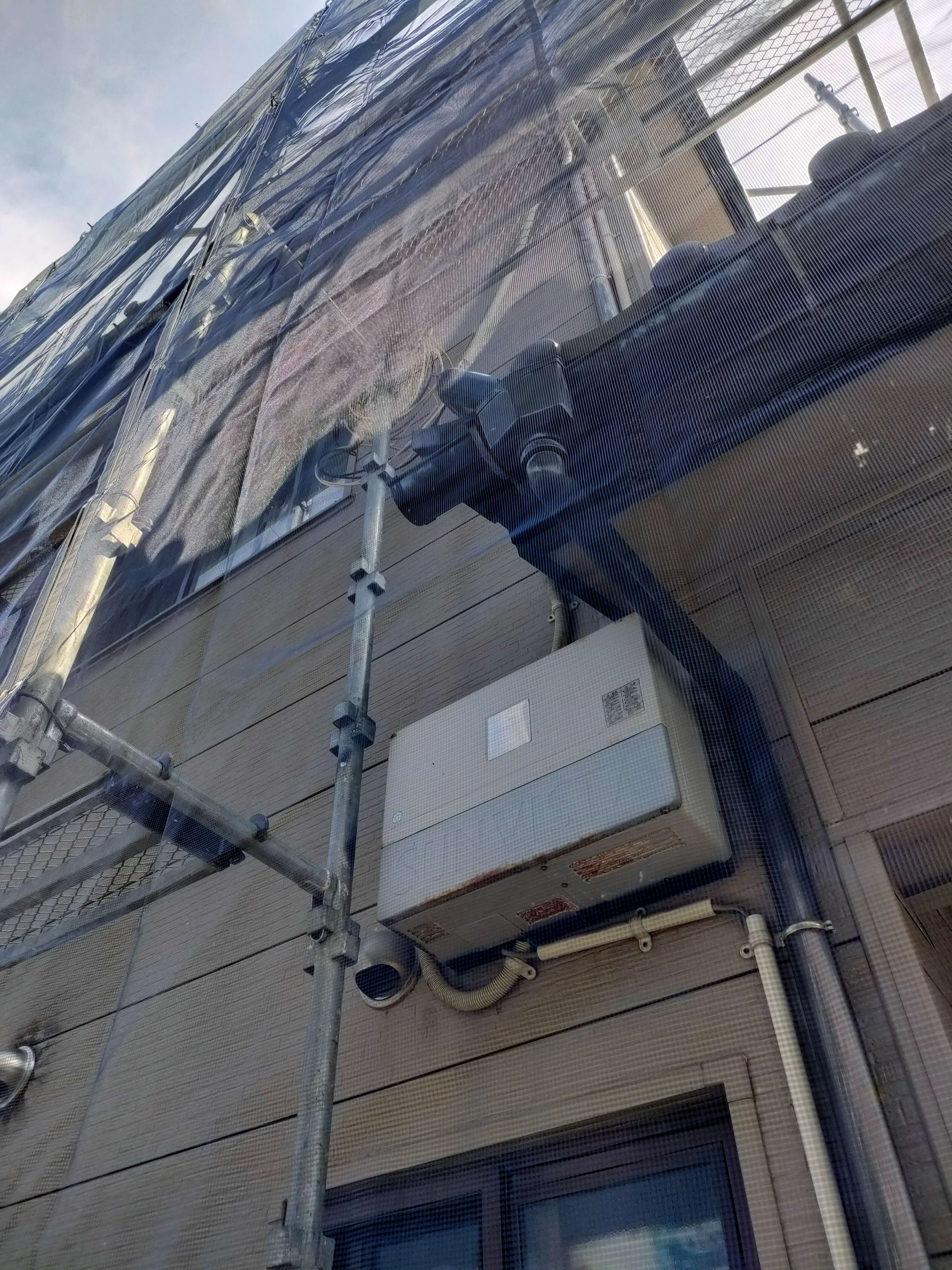 太陽光パネルの撤去は、単にパネルを屋根面から取り外すというだけではありません。余剰電力場合、外線からの戻りなどの関係もあり、確実に外部との連携配線を切断しておく必要があります。また、古いタイプのシステムですと、外部にパワコンなどの設備がありますので、その中で漏電しないようにするなどの処置も必要になります。これらの機器を壁から外すという手もありますが、取りついていた位置にビス孔なども空いてしまうこともあって、よほど問題がない限りは壁面についているものはそのままにする方向で作業しました。