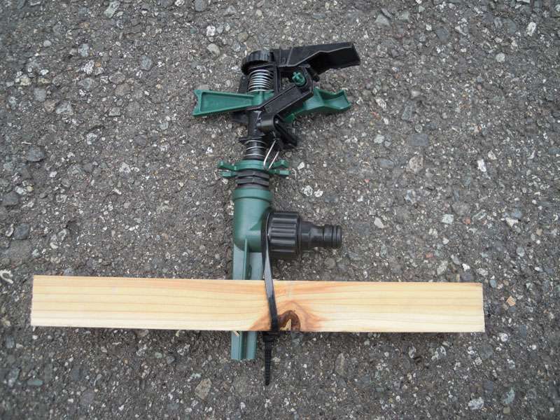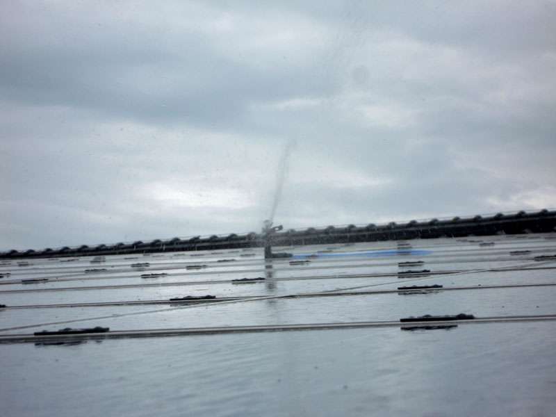 メインの装置はスプリンクラーとホースだけ(^^) これを太陽光発電パネルの広さにあわせて設置します。当社の場合は2個設置してみました。設置後の散水テストでも見事に太陽光発電パネルに水撒き出来ました。これから暑い日でどれくらい発電量がアップするか楽しみです。本格的なシステムにするためには温度センサーや自動水栓なども必要になります。専用のシステムとなると数十万円のコストが掛かりますが、今回のシステムはDIYとしてできるレベルなので部材費は7,000円ほどでした。
