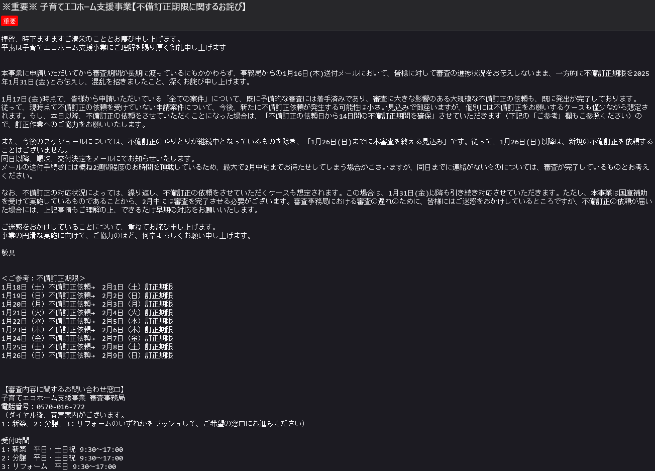 このメールだけを読むと、「最終の不備訂正の期限」は1月31日までってことが第一番で、もう一つ、