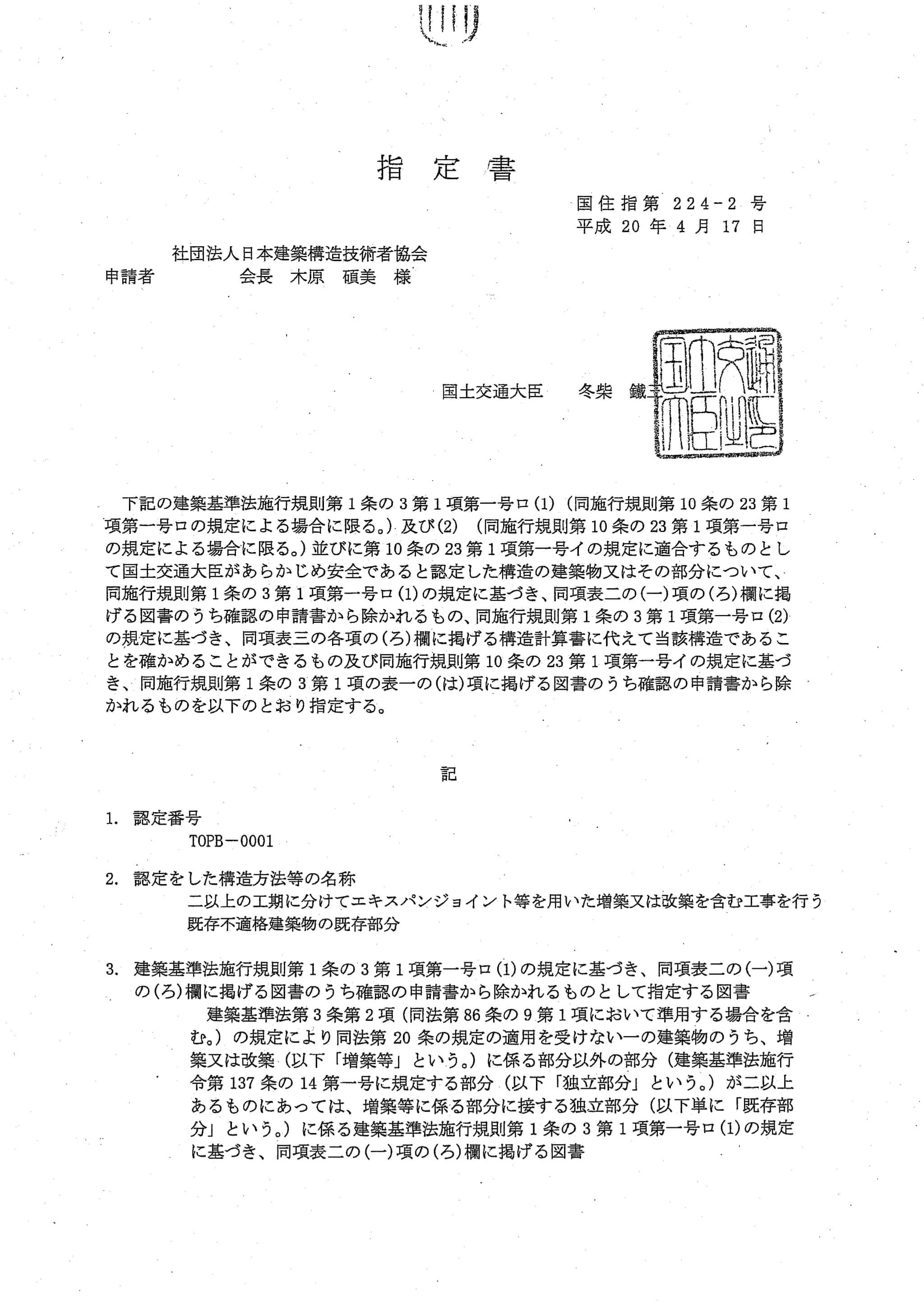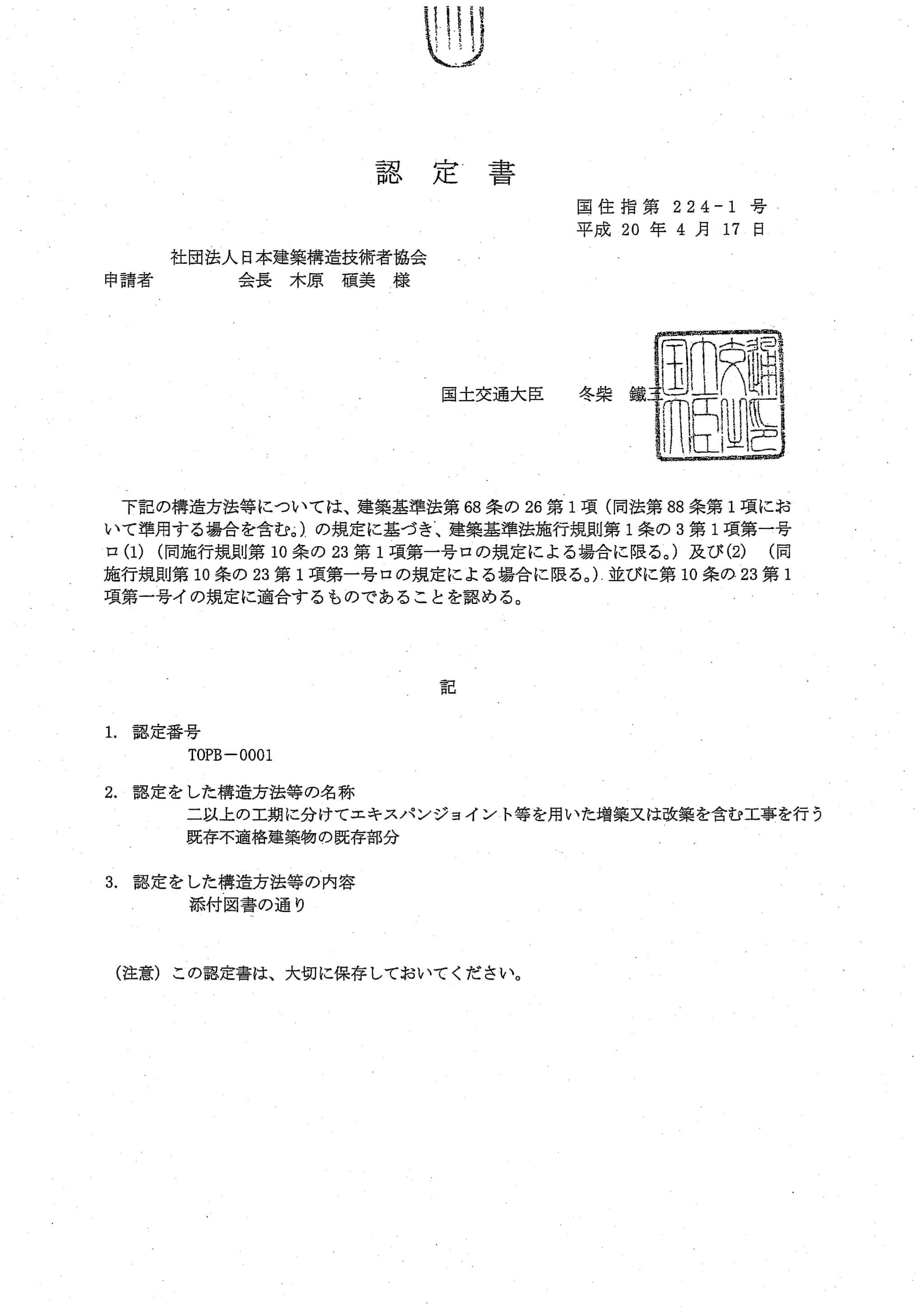 これは「TOPB-001」という認定番号を持つ構造方法なのですが、「全体計画認定」といわれる認定を行う際に持ち出されるものです。これがいわゆる「エキスパンションジョイント(以下、EXP.J)」といわれる構造で増築工事を可能にするというものなのですが、ここに「構造方法等の内容」というものがありまして、
