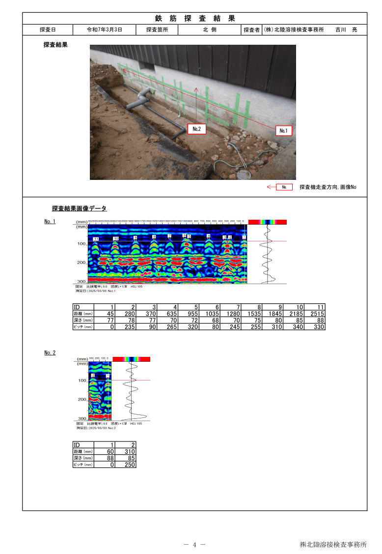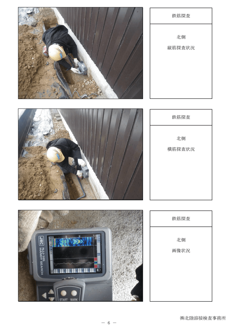 基礎については一見コンクリート製であることはわかりますが、問題になるのは、鉄筋が入っているか?ということなのです。これについては超音波検査などで鉄筋の存在を面で探査しなければわかりません。金属反応を調べる機械などでよいわけですが、それがどのようなピッチになっているのか?ということを比較的高い精度で調べる必要があります。