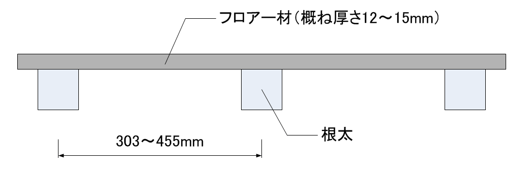 根太といわれる部材が等感覚のピッチで渡っており、その根太の上にフロアー材が張ってあるという状況です。ですが、この図はかなり古い住宅の床の構造です。昭和30年代くらいまで遡りますと、この根太の間隔が「455mm」と今考えると、そんなんで大丈夫か?と疑うような間隔だったりします。実は、これにはちょっと理由がありまして、古民家と言われるようなかなり古い建物の場合、床に今でいう「合板」をつかっている事例は少ないのです。使っていたとしても、台所や納戸、押入といった比較的立派な仕上げを要求しないような部屋のことが多いです。