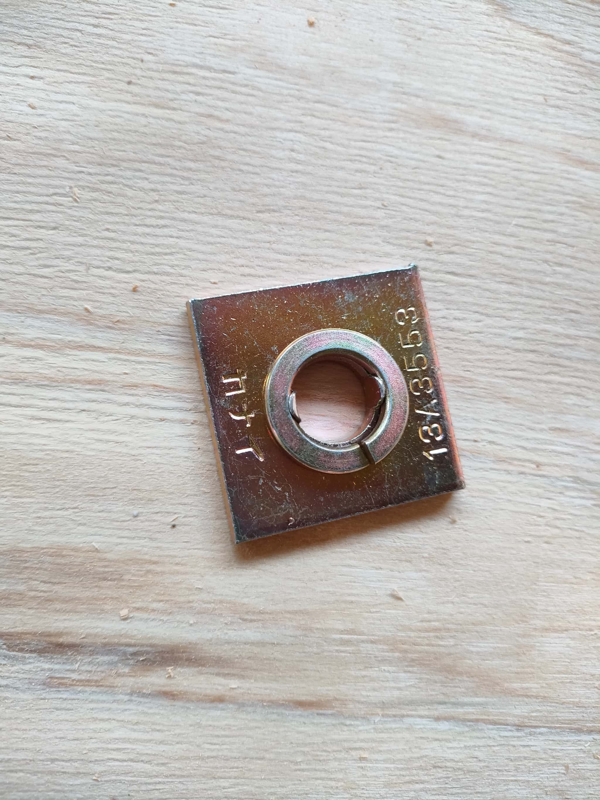 さて、ちょっと座金をご紹介しておきます。弊社が使用している座金は「スプリングワッシャー付き座金」あるいは「バネ付き座金」というものです。なんでバネがついてるか?といいますと、ナットを閉め込んだときに座金の「支圧」というもので強度を出しているわけですが、木材はどうしても収縮によって「木やせ」が生じます。その場合にナットが緩む現象が発生します。ナットが緩めば強度低下につながりますので、バネの部分で木がやせた場合でも、座金自体の支圧は維持することができます。まぁ、これも当たり前に使われるようになりましたw