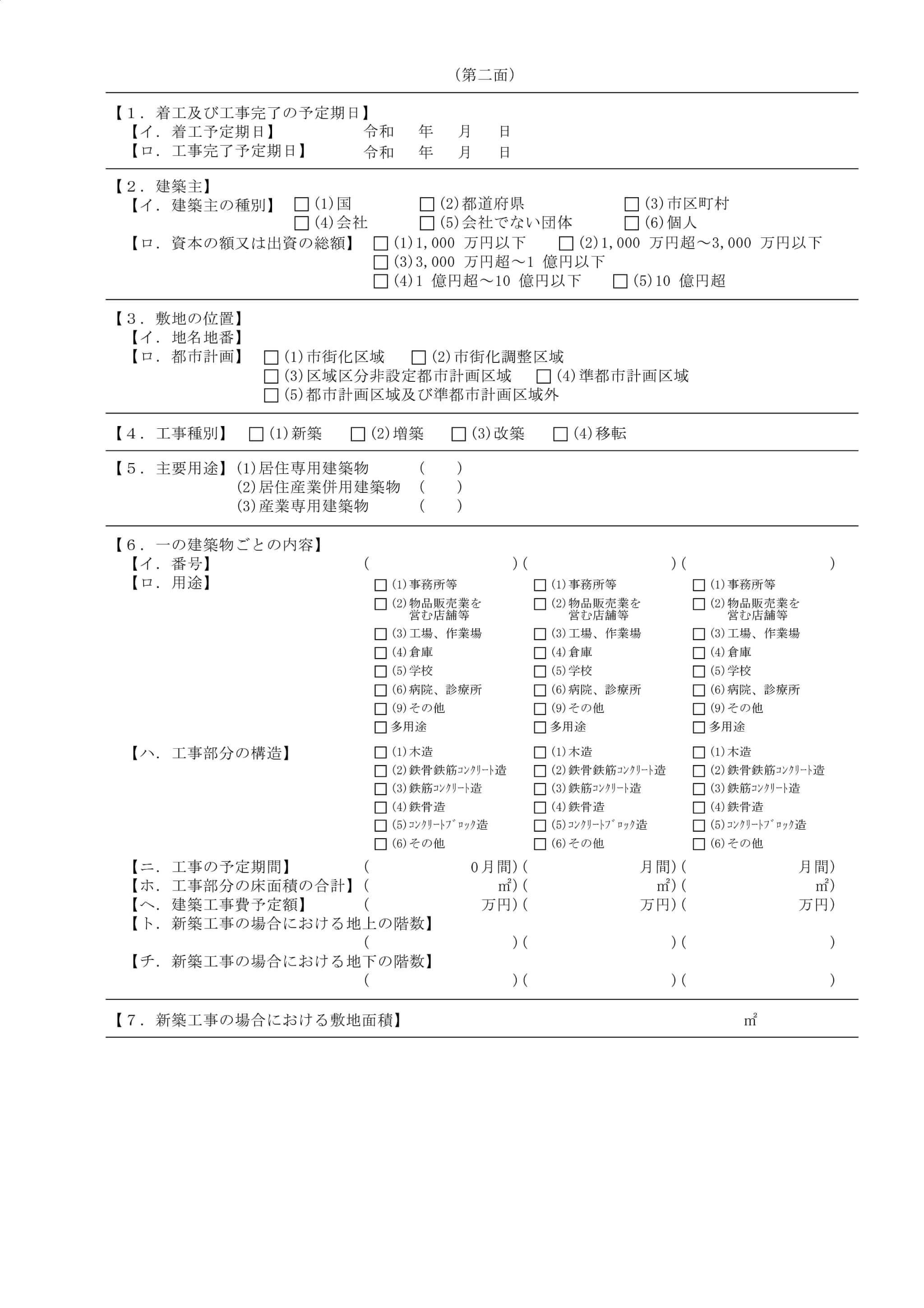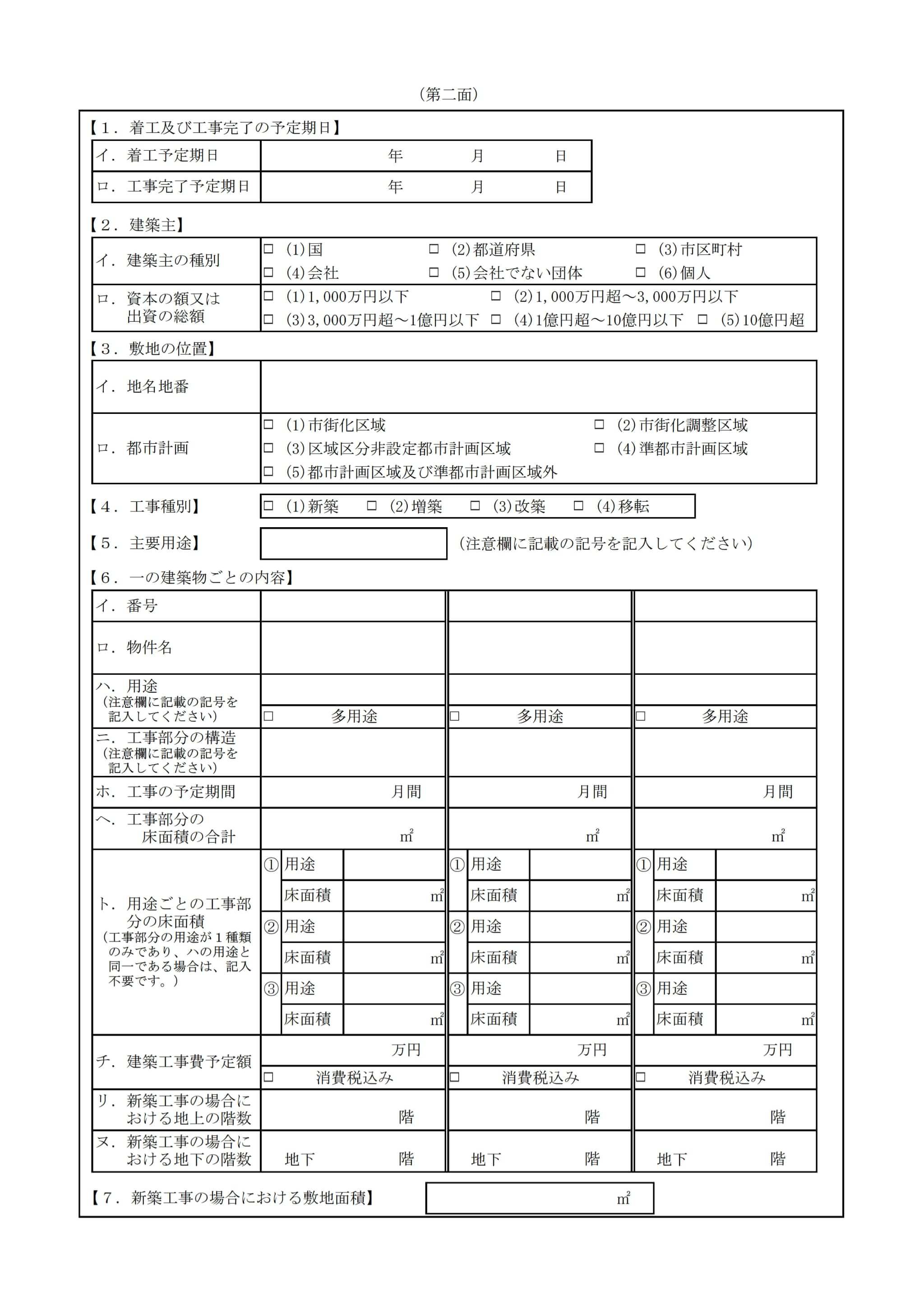 変更点の多くは簡素化を目的としているのと、同時提出する「建築確認申請」の用途区分と同じ分類に変更したなどですが、画像をご覧いただいてもわかるように、書式をコンパクトにまとめてるという感じです。でも、こんな書式フォーマットにするなら、WEBでフォーム入力すればいいって感じにしてほしいなぁとも思いますw