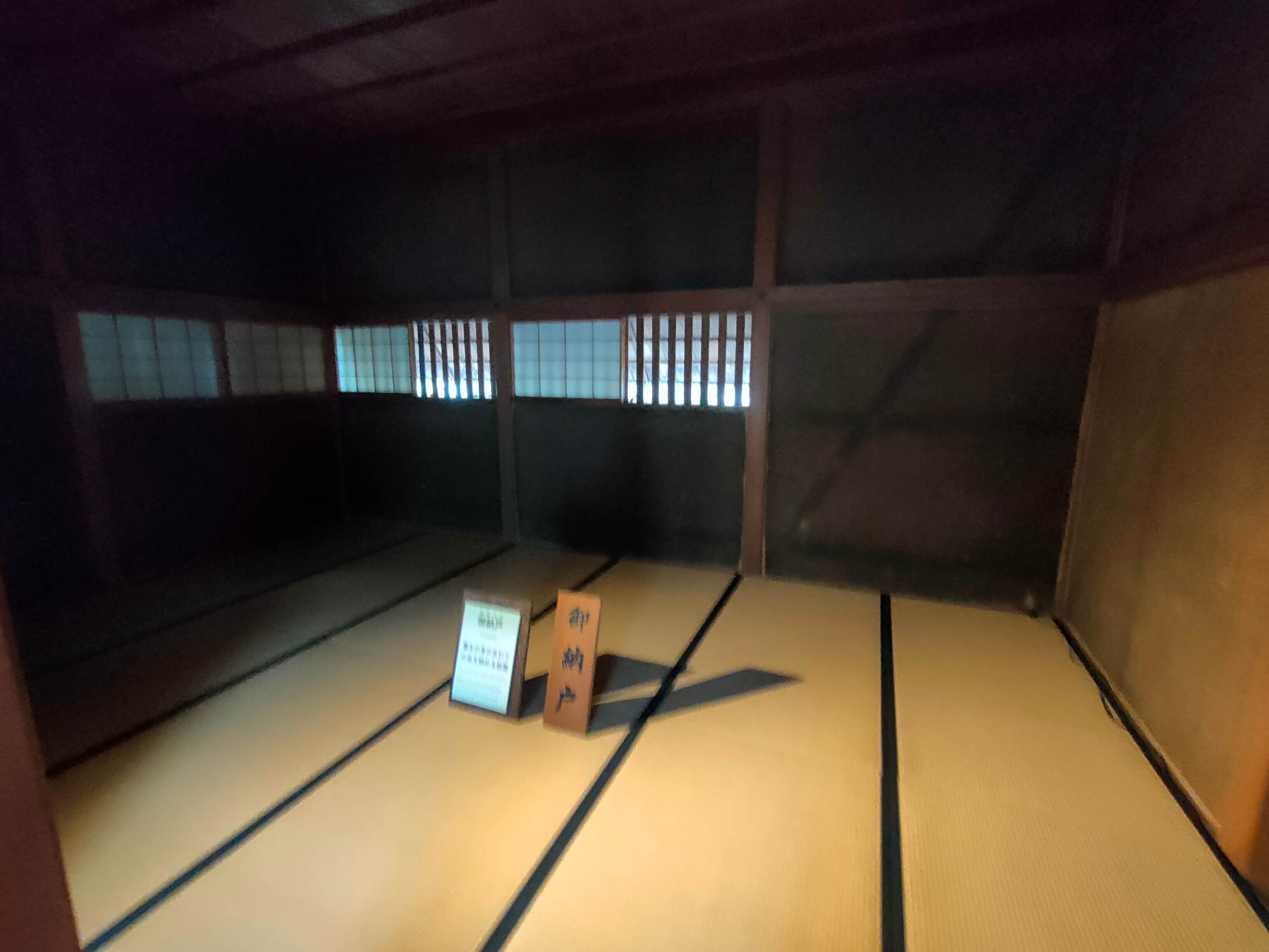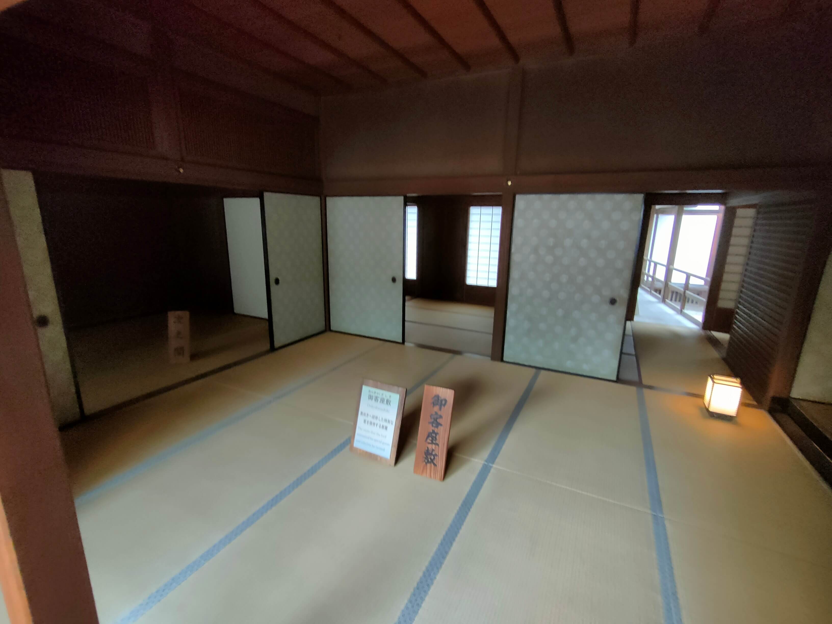 室内の納まりも江戸時代といえ、その設えに工夫があるようです。一つ目の画像は「御座間」といって、日常的に使う部屋のようです。壁は土壁で塗りモノがされているようで単調な趣ですが、襖の唐紙についてはちょっと派手さが出ています。日常生活でリラックスできる雰囲気として採用された柄なんでしょうか。もう一方の画像は「御客座敷」といって、お招きしたお客様でも結構プライベートでも心を許すことができるような関係性のお客様をお招きする部屋のようです。でも、客間であることもあって、唐紙をシックなものにしています。