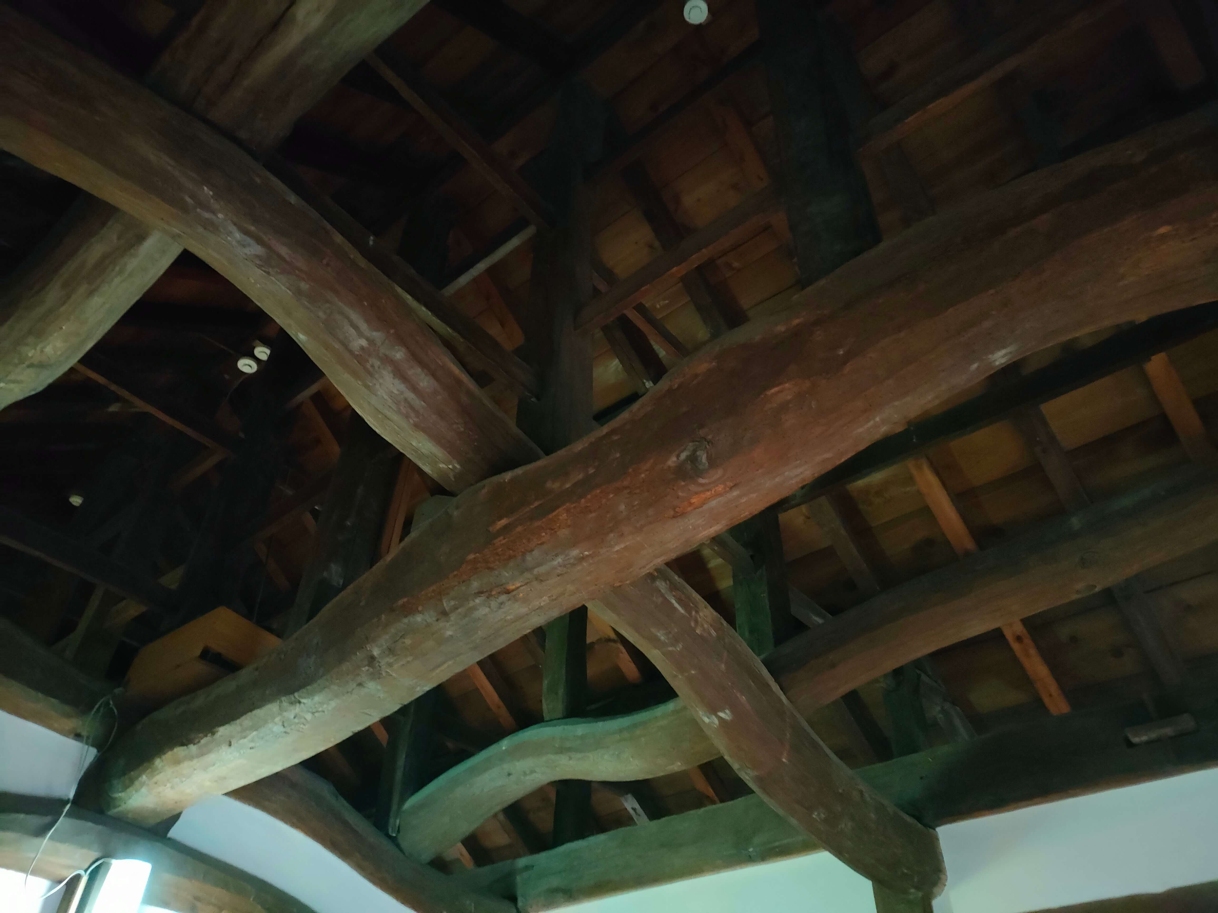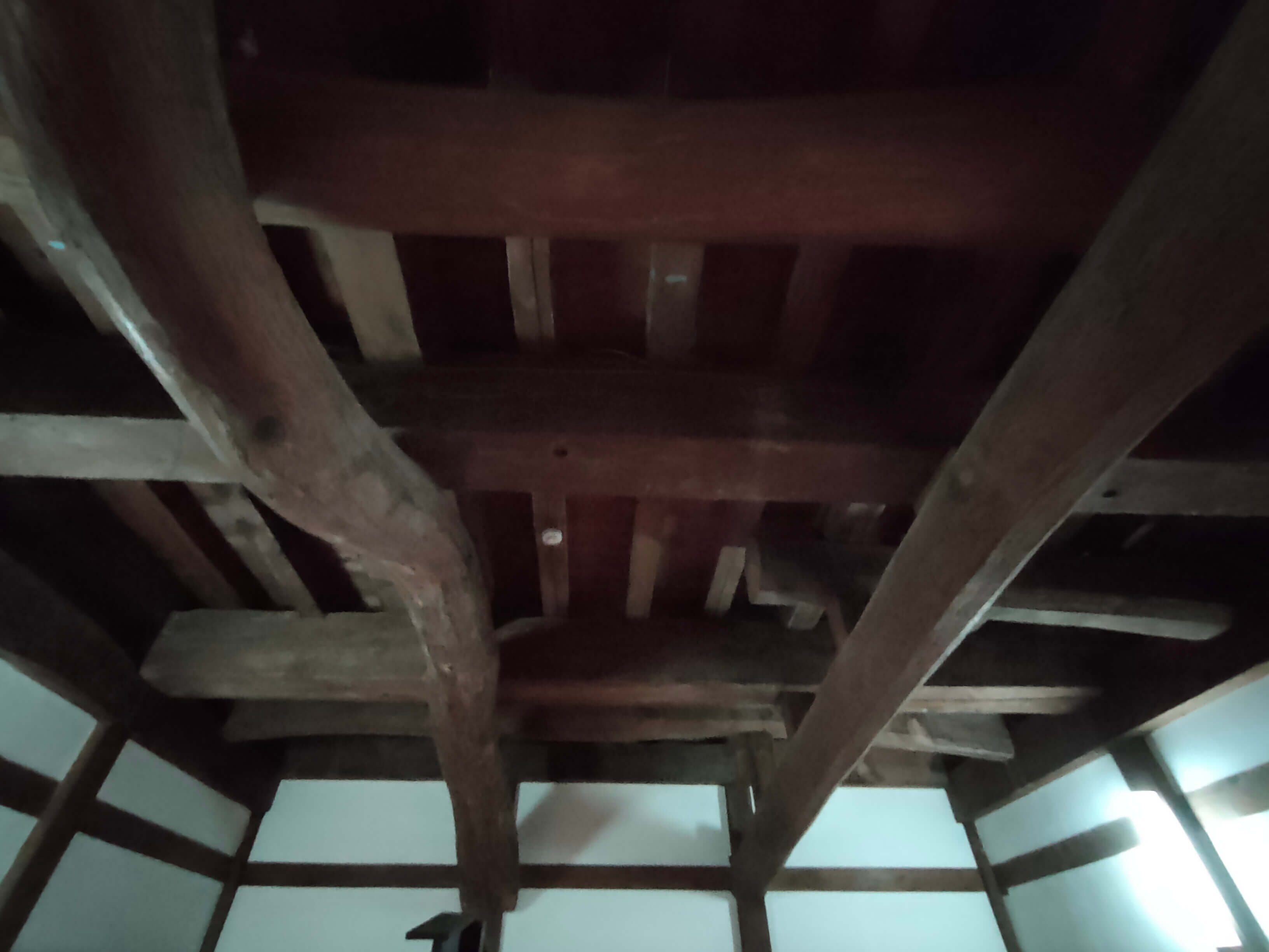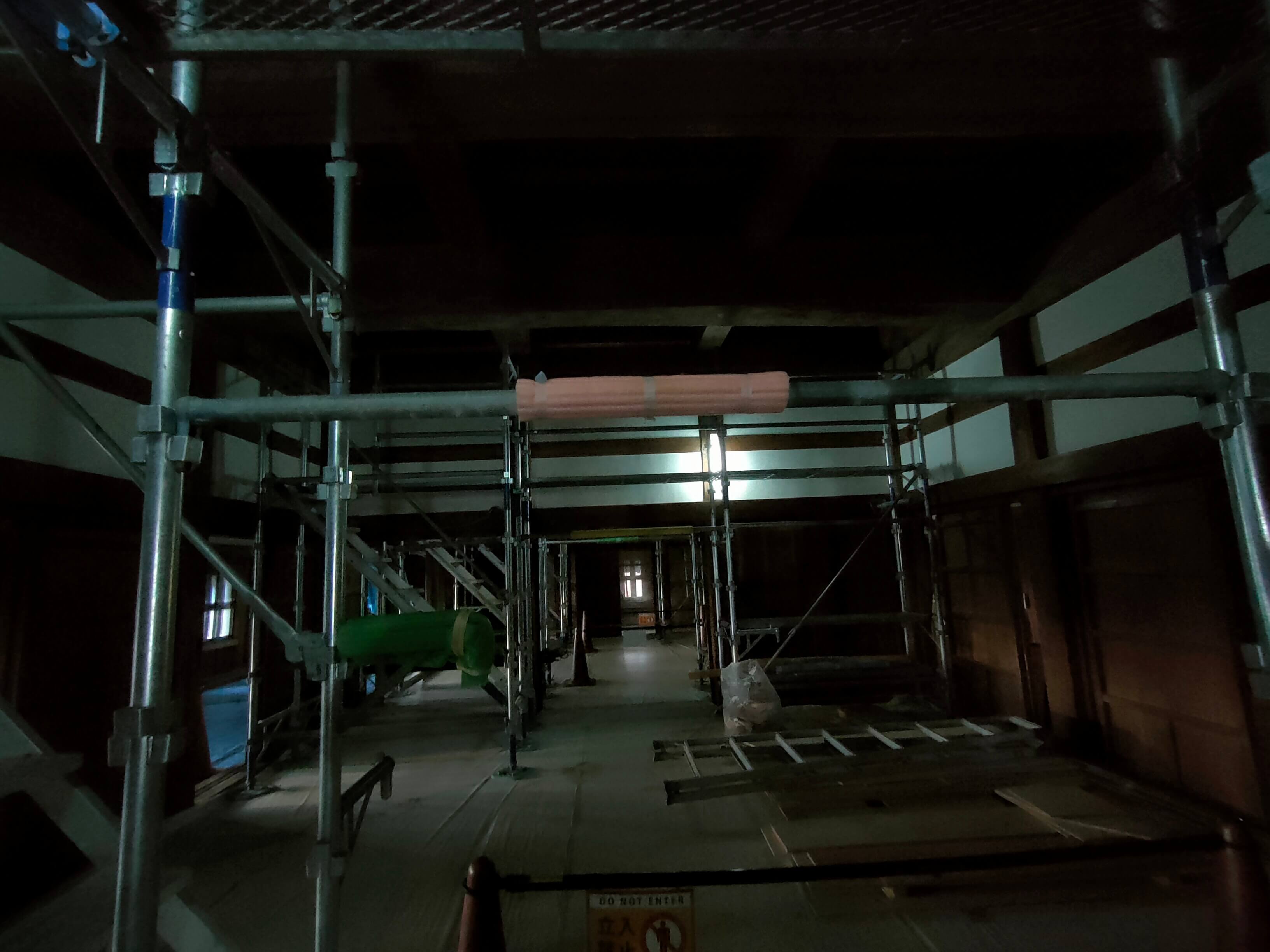 もちろん上階の床を支えるという意味では、床梁なども強烈な大きさですし、丸太組されているわけで、どうやって材料をそこまで上げたんだろうとか、当時の職人さんたちの叡智には脱帽です。さて、この日、本丸は「防災改修」として内部改修工事が執り行われていました。防災改修ということでよく掲示をみると、なんと「耐震工事」との記載が!