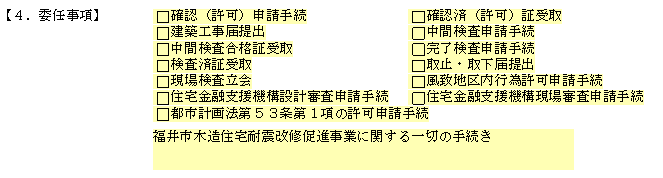 例えばこれは耐震改修工事の補助金申請関係の委任状になりますが、「4.委任事項」ということで様々な委任内容の項目が記載されています。実際は、委任する項目には✔マークが入ることで委任事項を明確にし、その項目がない場合に、別途空欄に内容を記載します。