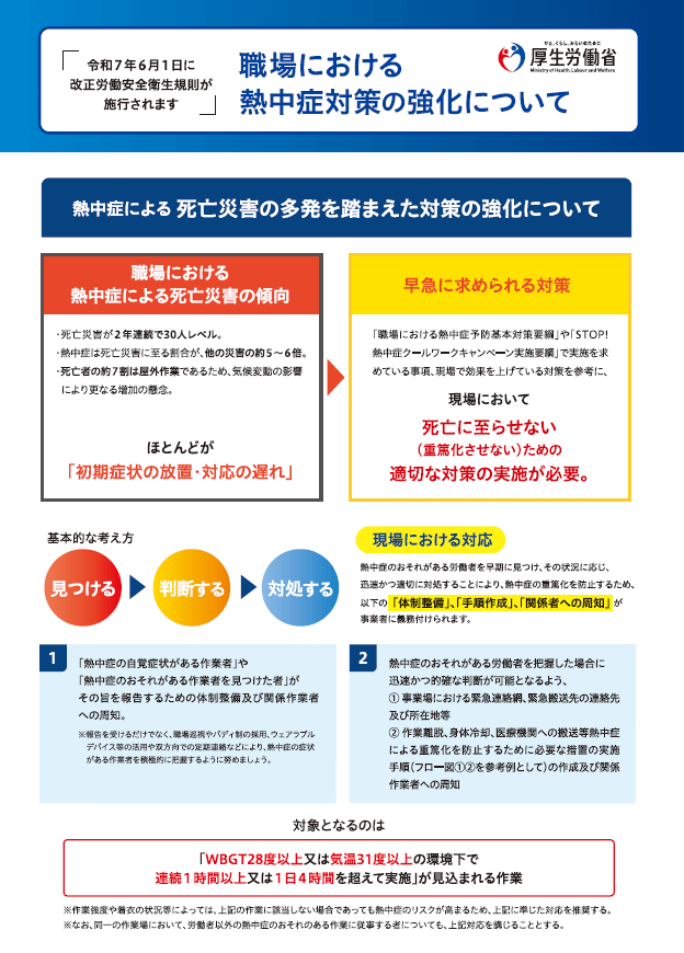 令和7年6月1日より施行される「改正労働安全衛生規則」では、明確に「熱中症」に対する対策を、