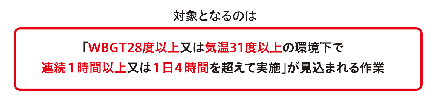 なのです。時間的に「連続1時間以上または1日4時間を超えて」ということも条件にはいっていますが、一日の上では、例えば工場内が、31度超えたり、WBGTが28度を超えれば、その工場に熱中症対策を義務化するというわけです。