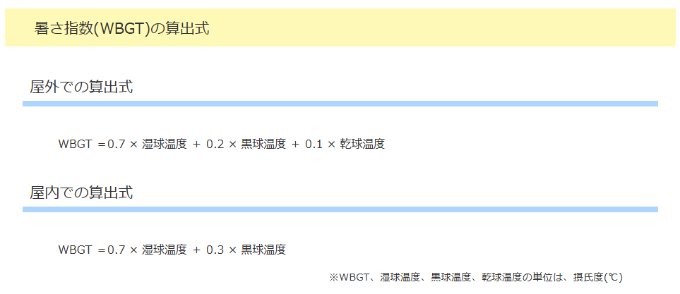 このような測定装置を元に、黒球温度、乾球温度、湿球温度を計測することで、ある計算式から算出される指数です。
