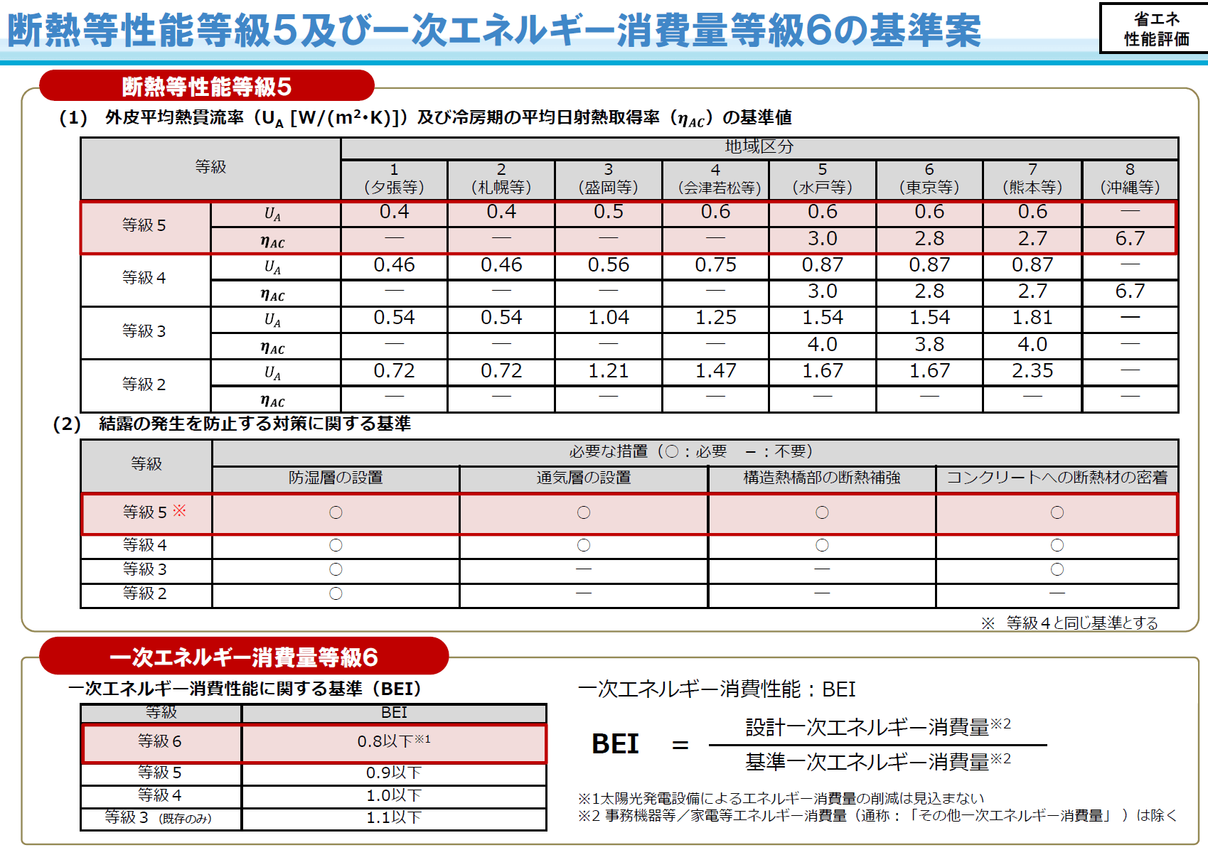 となります。となりますと、もはやだれがどう建ててもクリアできてしまう「等級4」レベルの性能では現状維持か古い建物がなくなっていく分でわずかに微増する程度ですので、抜本的な水準を高める必要が出てきたというわけです。そこで2022年に創設されたのが、等級4の上、「等級5」というもので、これをZEH水準として事実上の「基本ベース」とするというのが現在の国策としての省エネ基準なわけです。以下の画像は、2022年に国交省が新基準等級創設にあたり公開された基準案資料です。