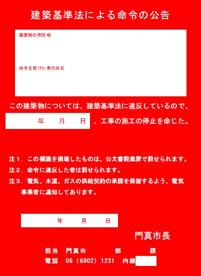 上の画像は、ネットで検索するとヒットしてくる「違反建築物に対する命令書」で、門真市の事例です。赤紙と呼んでいますが、これが工事中や完成後の建物に張られたら是正命令が出されているので従わないと罰則の適用を受けます。