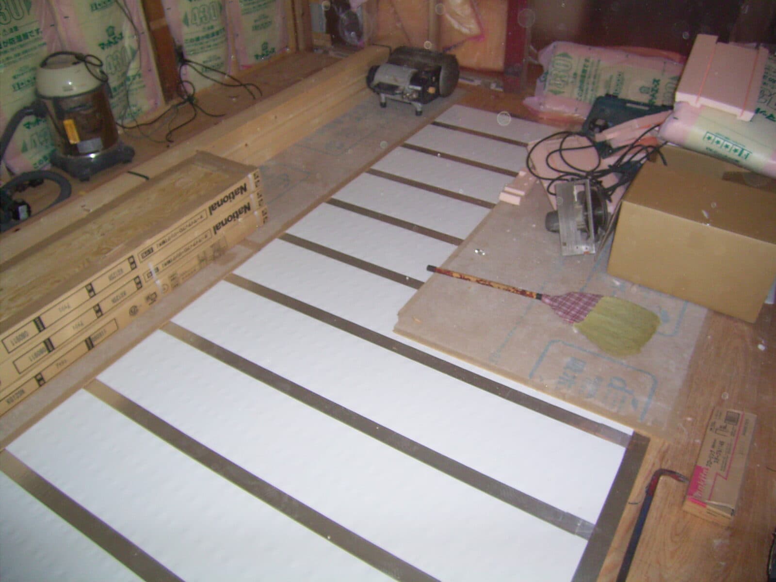 床及び壁、天井への断熱材施工と、さらに、SDN-SHEETによる遮熱施工を「内側」に施し、内部の熱移動を止めるような工夫をしました。そして、