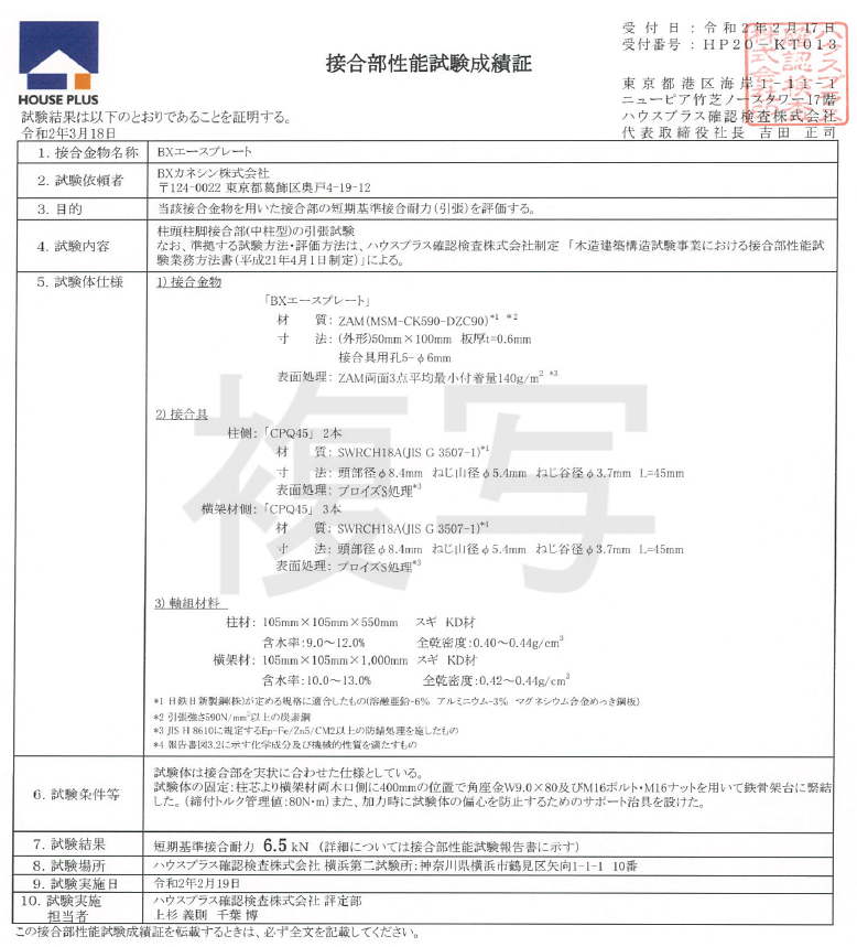 では、この認証の内容ってのをちゃんと精査したことがありますか?ってのが、審査を受けるにあたっての設計者としての必要な調査なわけですが、何をもって調べるかといいますと、「接合部性能試験成績証」といわれるものなのです。せっかくなので、「BXカネシン BXエーステンプレート」の成績証を示します。