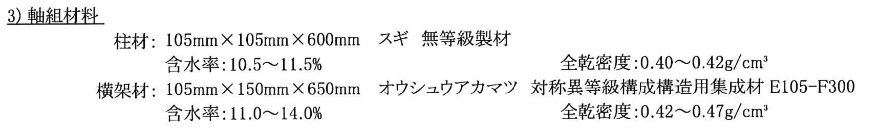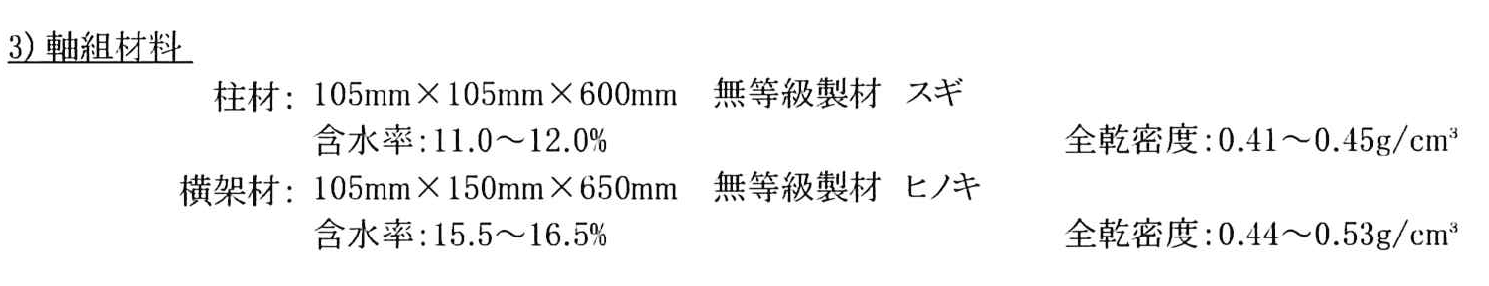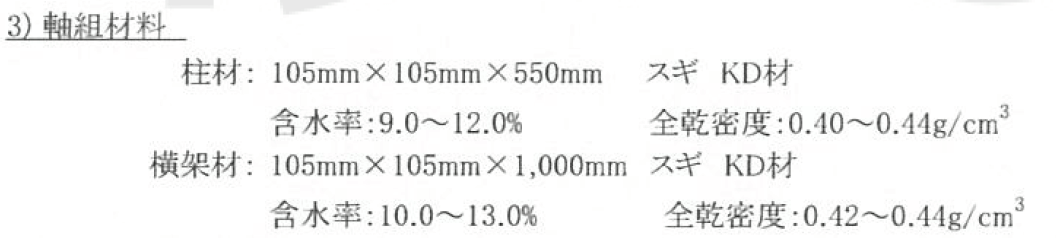 これ、試験体の仕様なんですが、重要なのは寸法と樹種なんです。例えば、柱ですが105角です。試験で105角を使ってるわけですので、これより下回る材寸法のものは「対象になりません」。また樹種は杉KD材です。これも同じで、これ以下の強度になるような材料は使えません。横架材も同じです。105角以上の材寸法ですので、例えば90mmの梁にこのプレートは使えないわけです。