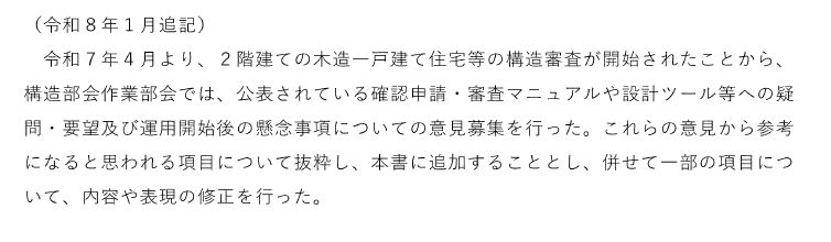 さて、それでも、地道に仕事をこなし、日々研鑽を欠かさない建築士はいるわけで、そういった方たちが改正法の運用でぶちあたった壁、特に、法解釈や法対応の面で質疑をたくさんしていました。これが「日本建築行政会議」でまとめられ、「木造建築物の特例縮小に関する取扱い集」として情報発信されていました。最初は、2024年9月で、今回の改訂は2026年版としてのブラッシュアップとなります。