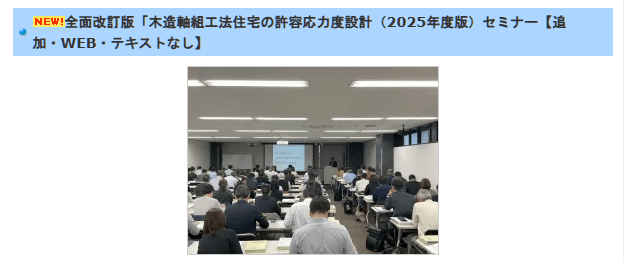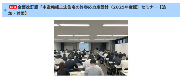 2025年10月に改訂発刊された「木造軸組工法住宅の許容応力度設計(2025年度版)」(以下、グレー本)ですが、改訂に伴う解説セミナーが(公財)日本住宅・木材技術センター主催で行われました。公開当初からセミナーの申込が殺到し、あっという間に満席になりました。