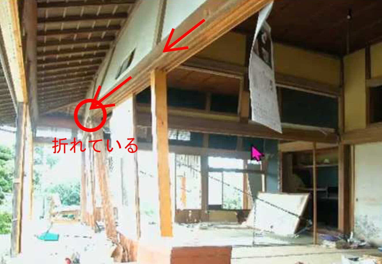 柱が耐えられるかどうかは、「柱の太さ」に関係します。この画像の住宅の場合、いわゆる日本家屋としての和風の真髄がデザインされているように、大開口の窓が建物周囲に連続的に配置されています。つまり、耐力壁がほとんどありません。そのため、この「垂れ壁」の部分に集中してこの部分に相当な力が加わったわけです。そしてその結果、柱が折れてしまったというわけです。