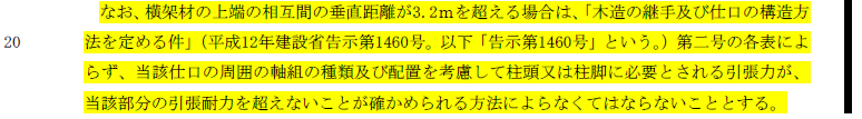 これは3.2mを超す場合には、柱の設置位置と金物の種類の表を使った金物の選定は、横架材天端距離が3.2mを超す場合は、最低でもN値計算を求めるということを、事実上、明示したことになります。まぁ、3.2mを超えるというのは、どちらかというと、非住宅、施設建設に多いわけで、そんな建物を設計するのに、構造部分を「仕様規定に頼る」、「構造計算はしない」ような設計者は、すでに、構造に関する判断力量がかなり不足しているので、こういった文言を追加することによって、法的な側面でも抑止しているのかな?と感じます。