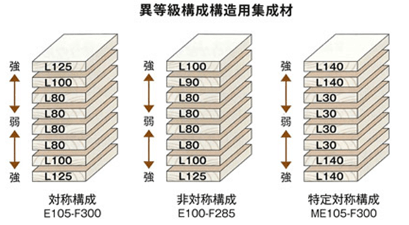 まず、「異等級構成構造用集成材」というものがあります。「異等級」という言葉が表すように「集成材のラミナの強度が同じではない」状態の集成材を指します。具体的には以下の図をご覧ください。