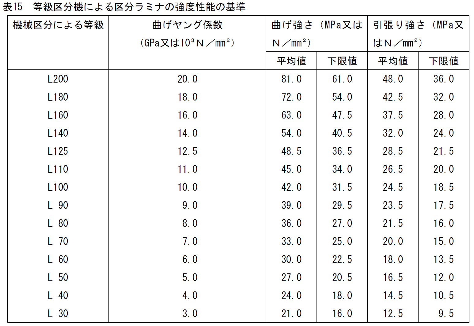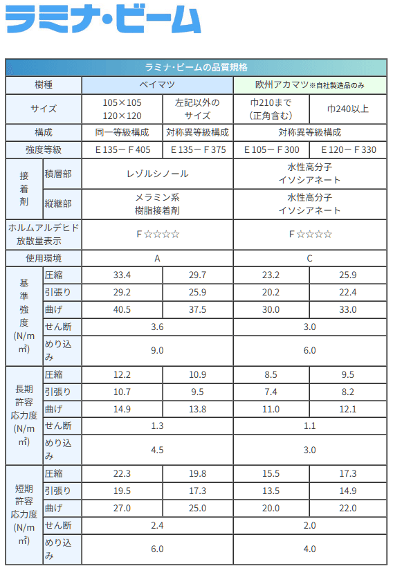 さて、ここで、以前のブログでご紹介した中国木材株式会社のラミナビームの品質強度の表を再度お見せします。