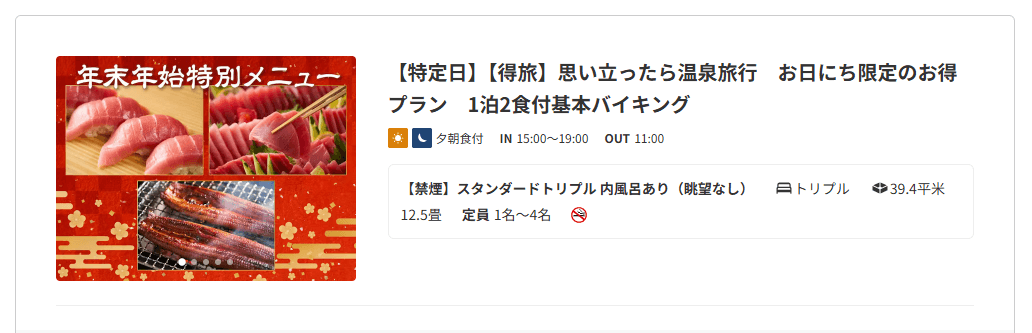 家族大人4人で、税込\64,600というプランなんですが、割引プランとポイントの即時利用でなんと\58,140という価格!一人15,000円切ってますw もうこれはポチっとかないとダメやろってことで予約をいれましたw というか、これをご褒美に年末までがんばれた気がしますwww