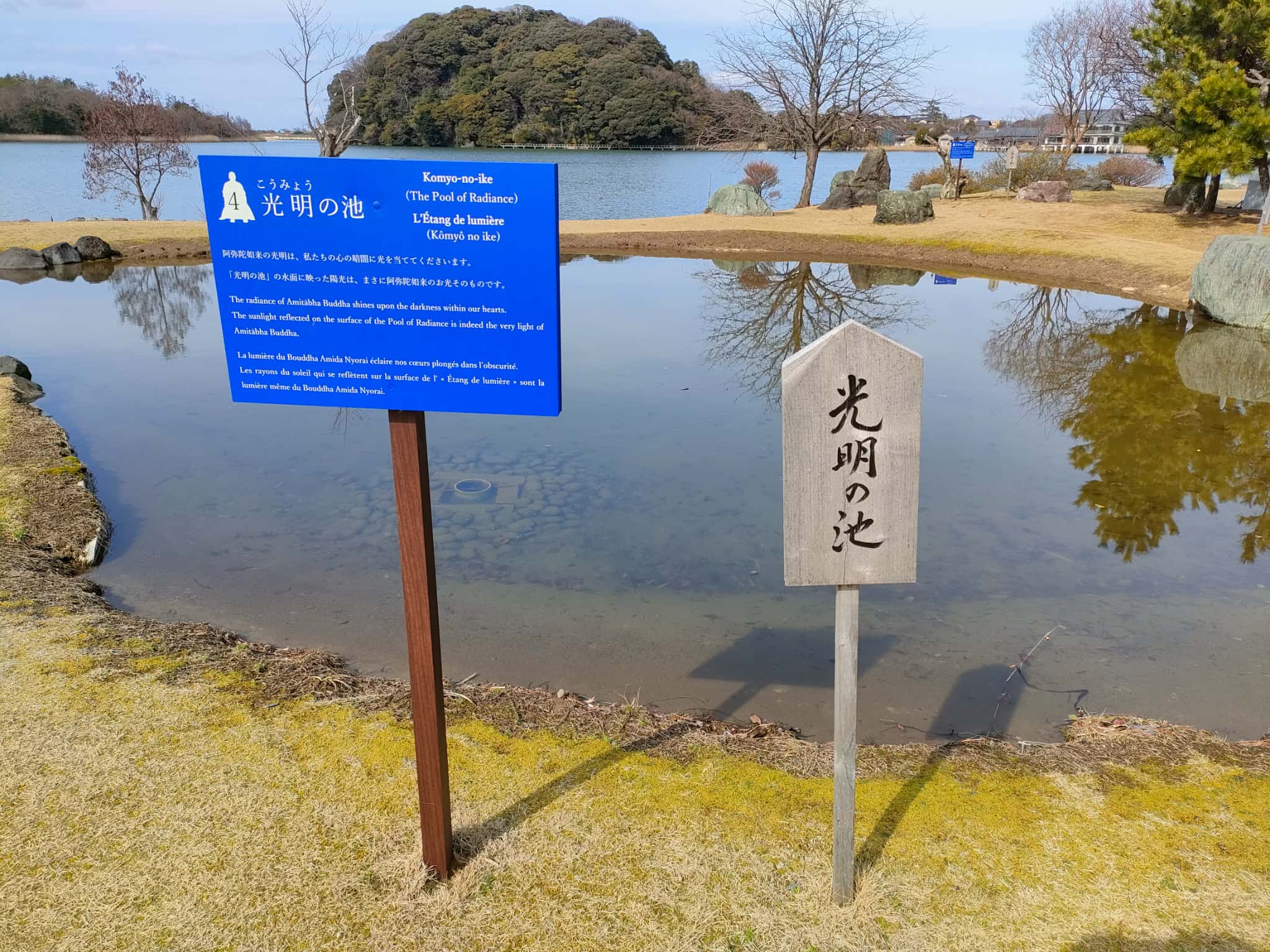 庭園は「仏法」による教えを現すテーマであちこちにモニュメントを作っているのですが、例えば、「光明の池」と題して、水面に映った陽光を阿弥陀如来の光としていたり、