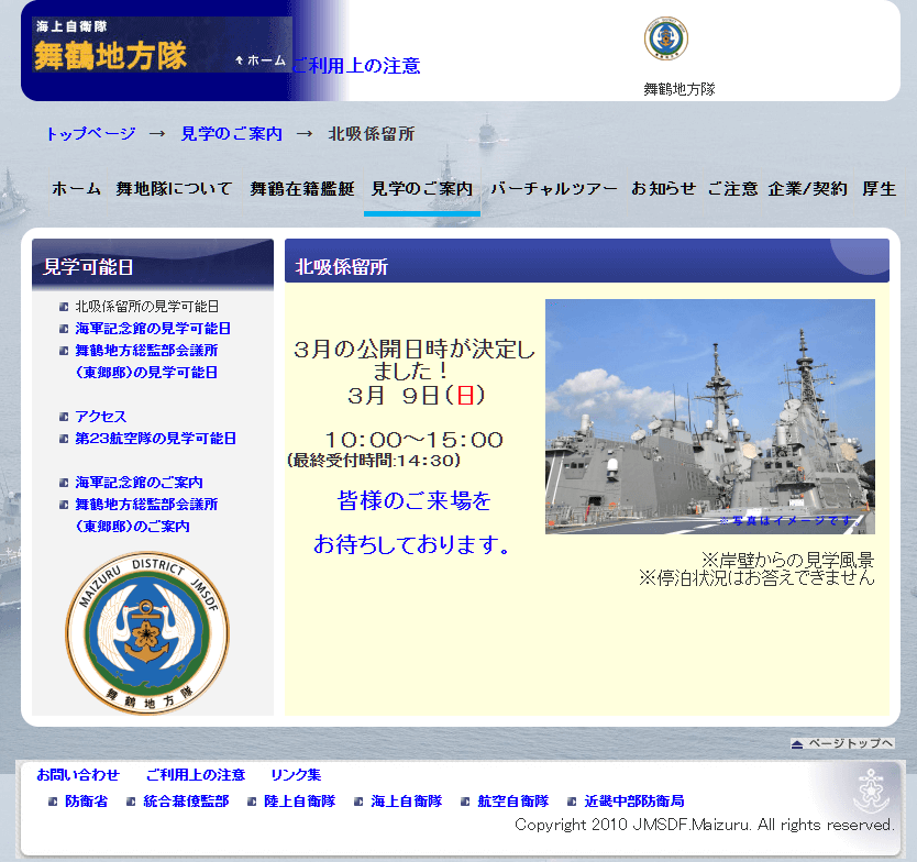 海上自衛隊の艦艇はイベントとして展示されることが年に何回かありますが、そのほかにも係留所の公開見学日を設けていたりします。ただ、定期的にその見学が開催されるわけではなく、直前になって公開日の告知がなされます。今回も週末どこに行こうかな?とたまたま舞鶴地方隊のホームページをみていて公開情報を発見しましたw