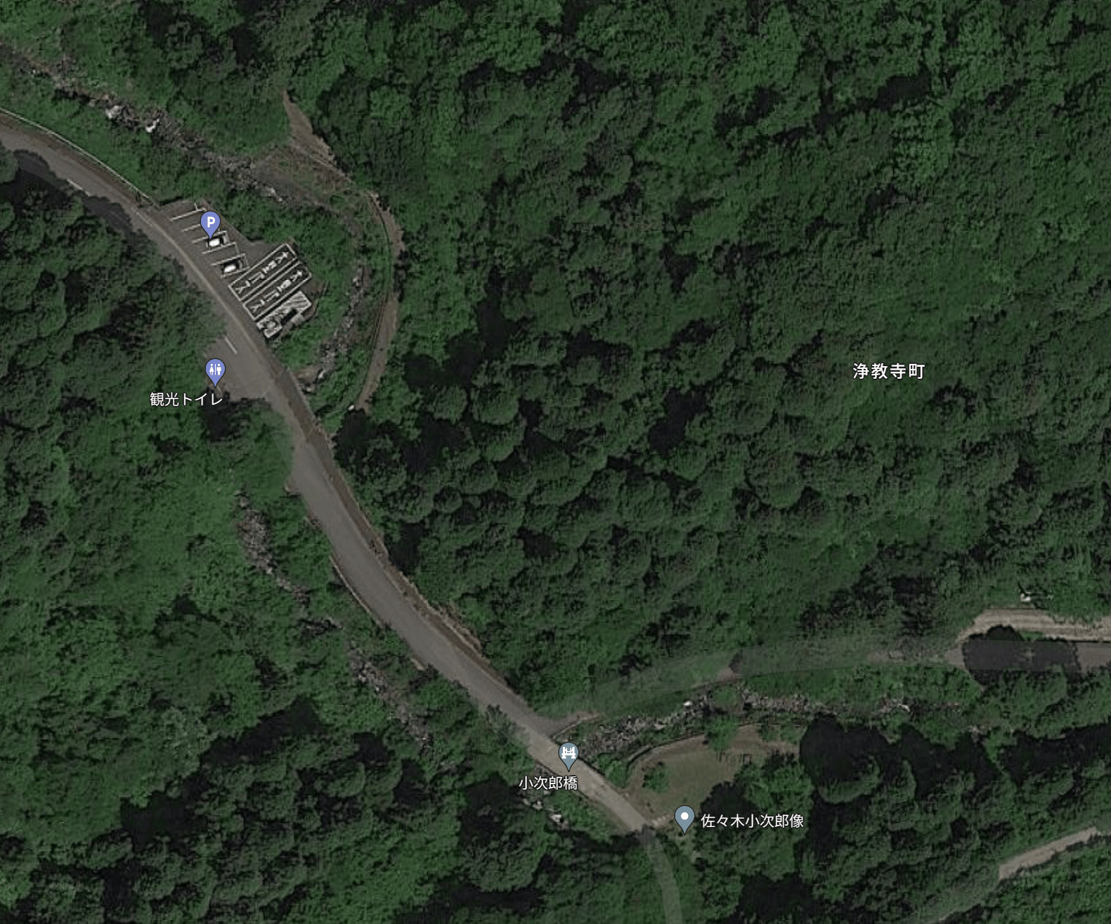「一乗滝小次郎の里ファミリーパーク」を通り過ぎるようにさらに山沿いを走ると、ちょうど滝のところで行き止まりになっているのですが、この手前100m程度のところに、観光トイレと駐車場があります。台数はそれほど多くないので、結果として、山際に路肩駐車の車が並ぶことになります。