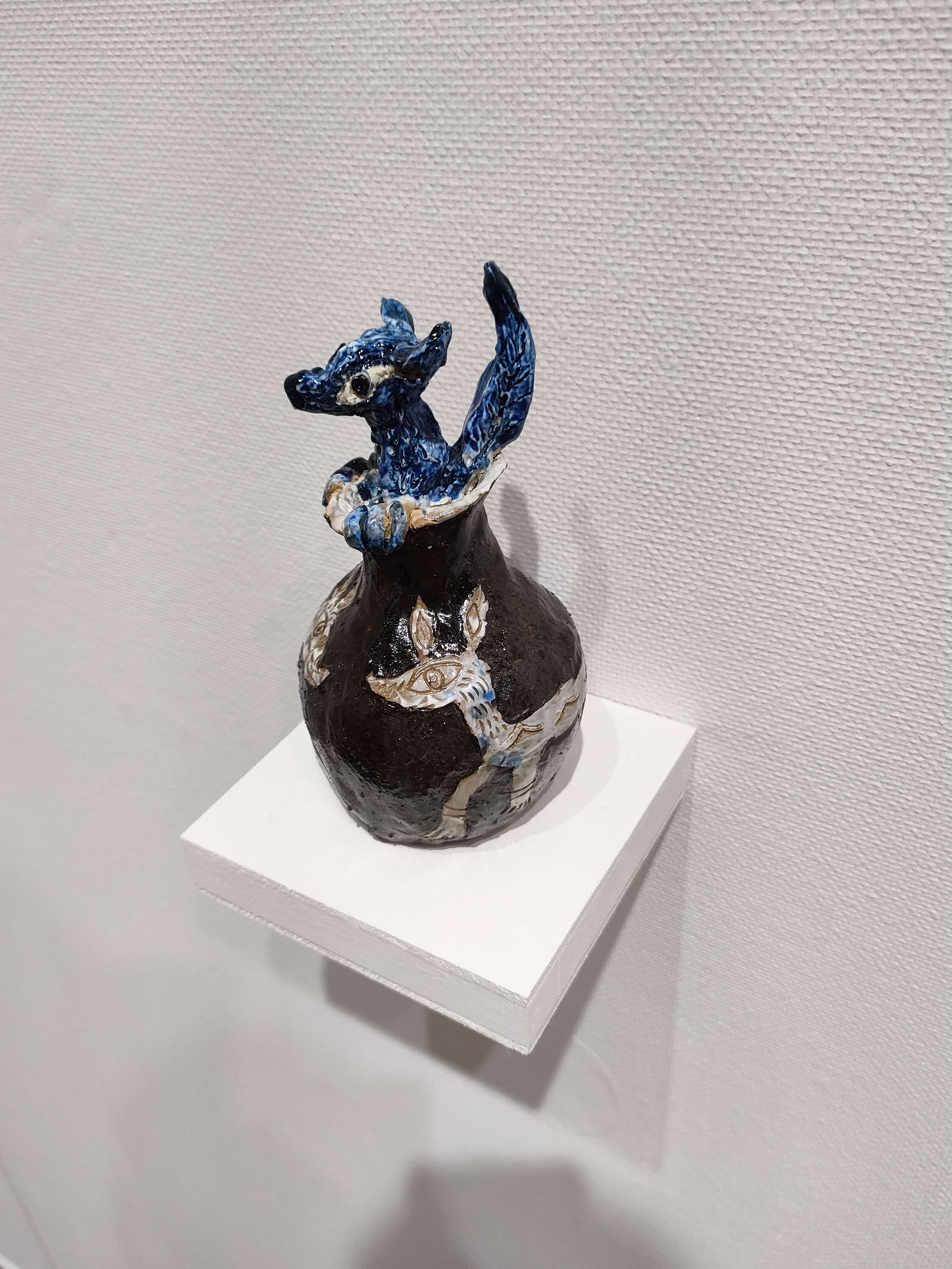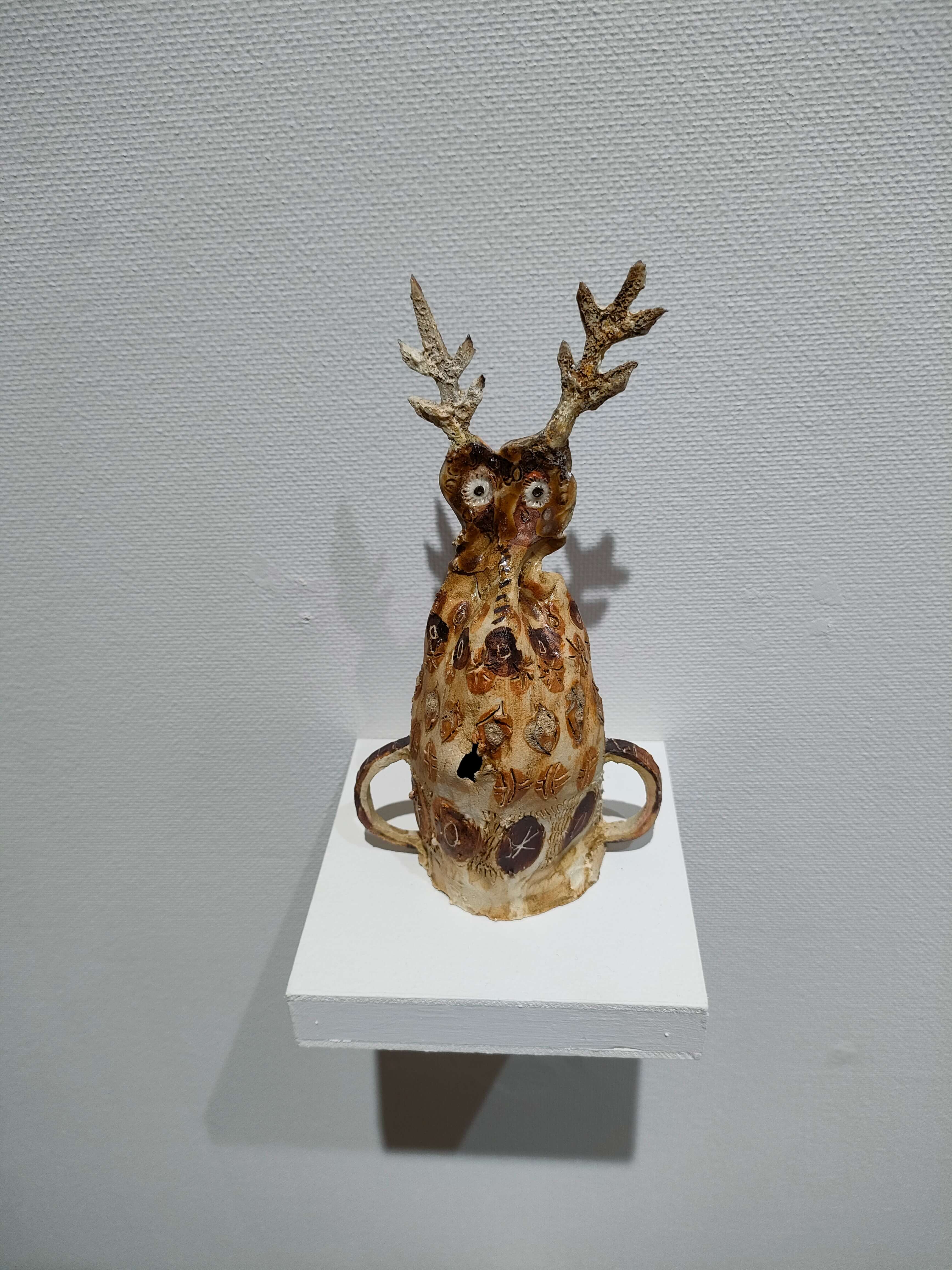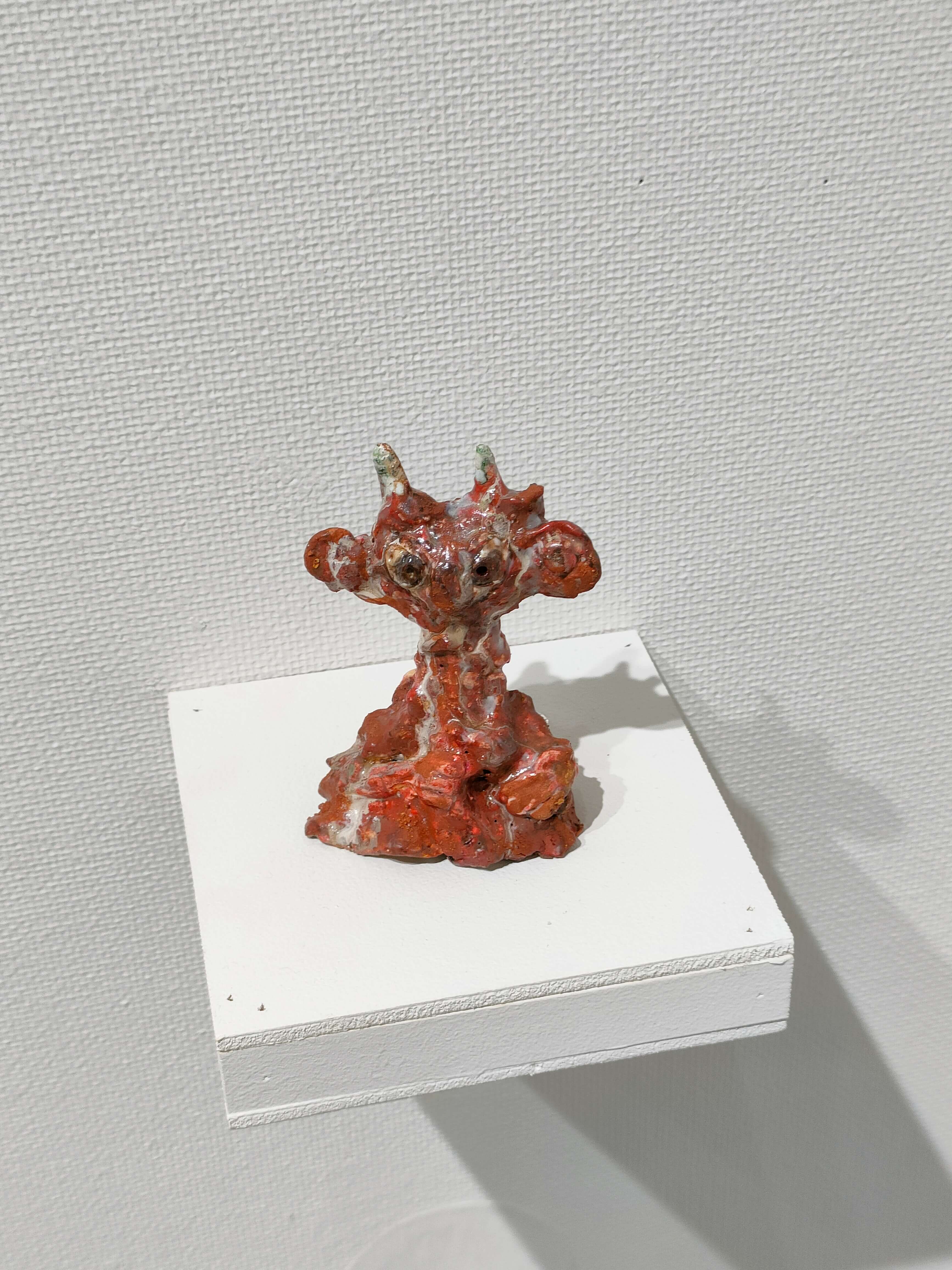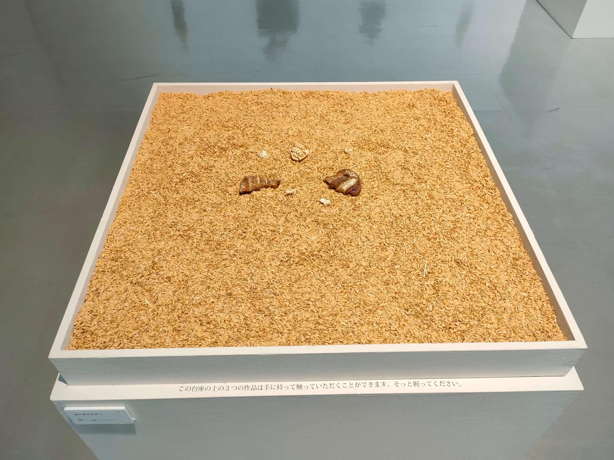 これ、粘土を握っただけのものなんですが、おがくずが敷き詰められている上に置かれていると、なにか、虫のようなものに見えます。もちろん触れますw というか、触らせることが目的の作品です。
