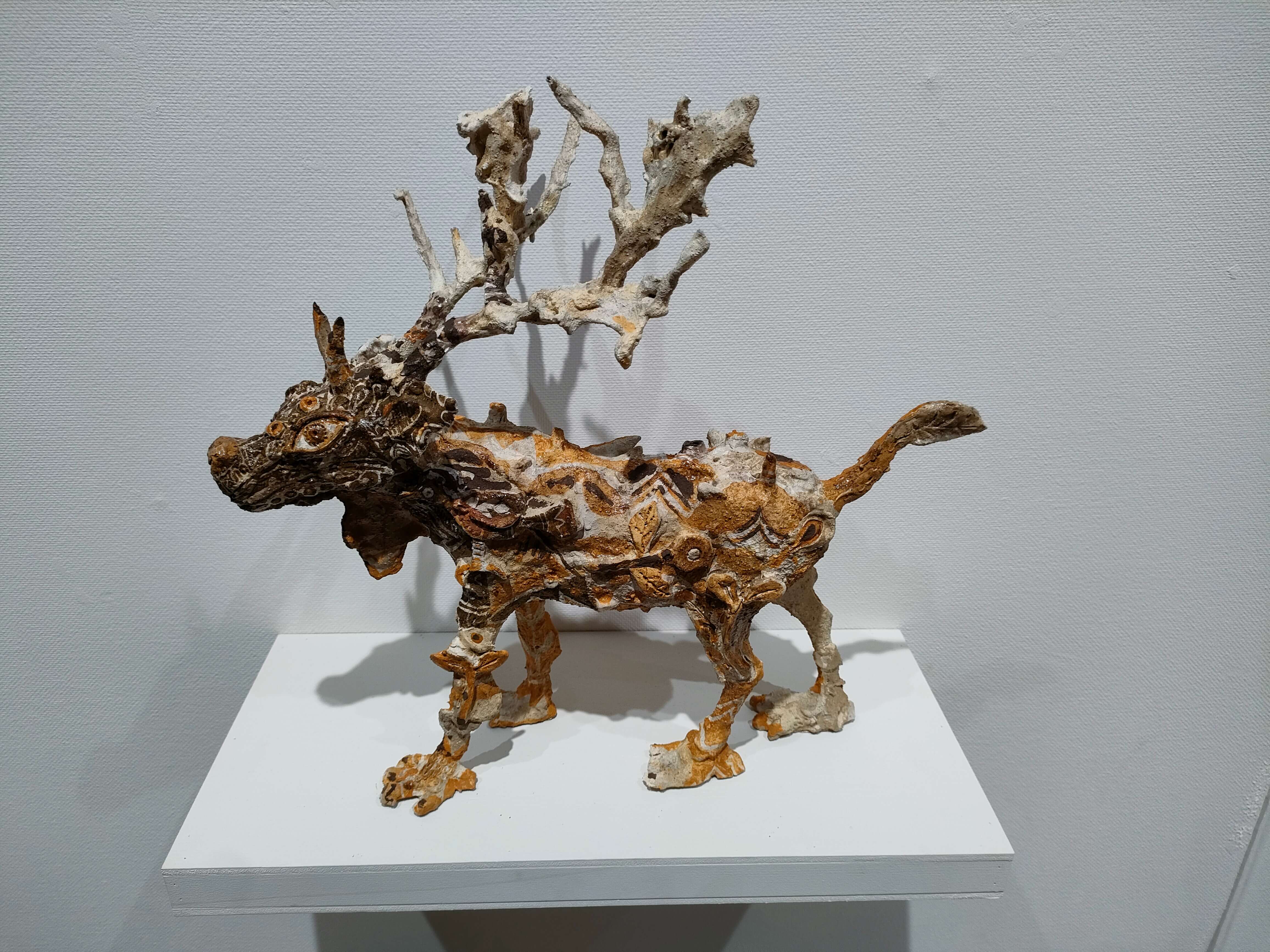 自然素材を使って形づくるという点では、土で絵を描くだけではなく、粘土や枝、石をつかってイメージをつくりだすことも。自然と向き合う作風の方は多いですが、なんとなく、「とことん突き詰めて自然と向き合ってる」という印象を持ちました。そして、圧倒的な迫力のあった作品がこれです。