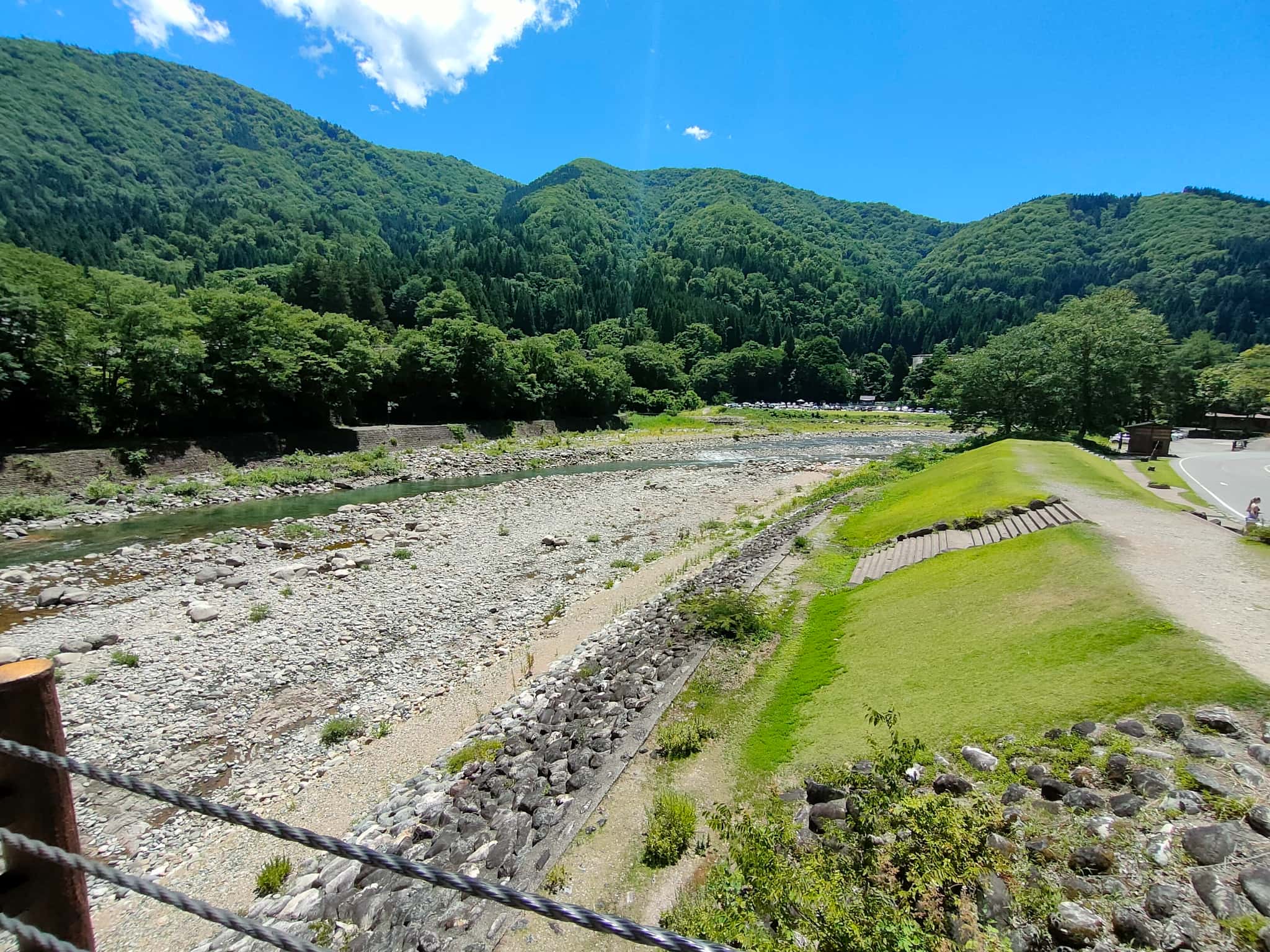 というわけで、せせらぎ公園駐車場からは、「であい橋」を渡って白川郷へ。