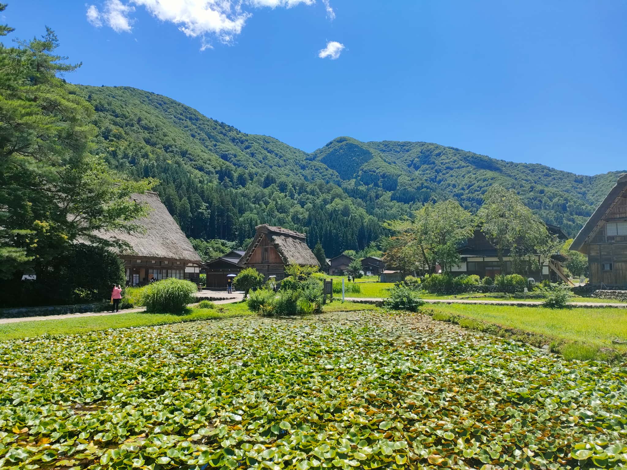 夏の白川郷は、青々とした田園の中に、合掌造りの家々が見える風景なのですが、暑いですが、この時期の白川郷が個人的には一番好きです。なんとなく、小さい時の田舎の親戚のところに遊びに行ったおぼろげな思い出が蘇ります。