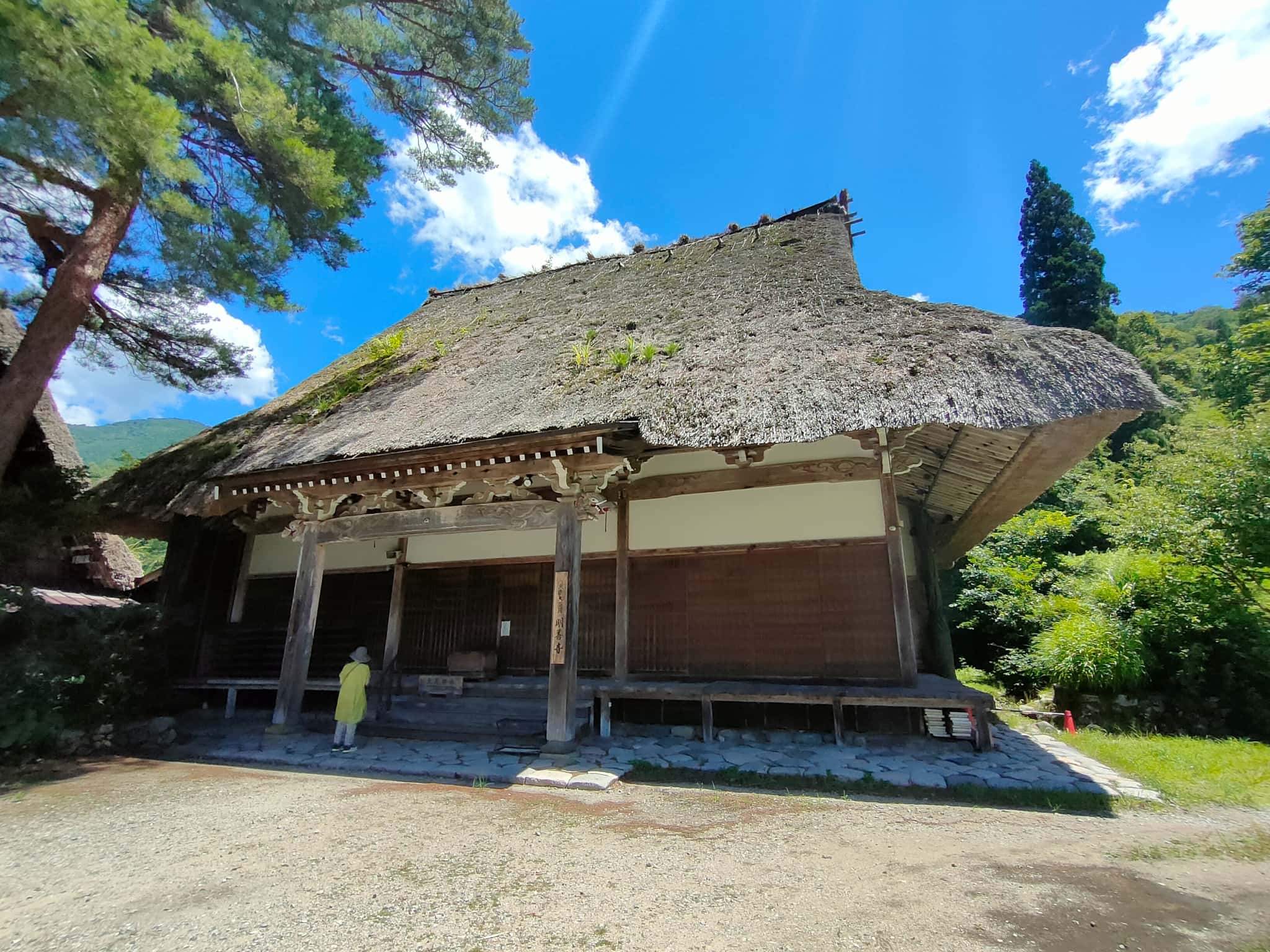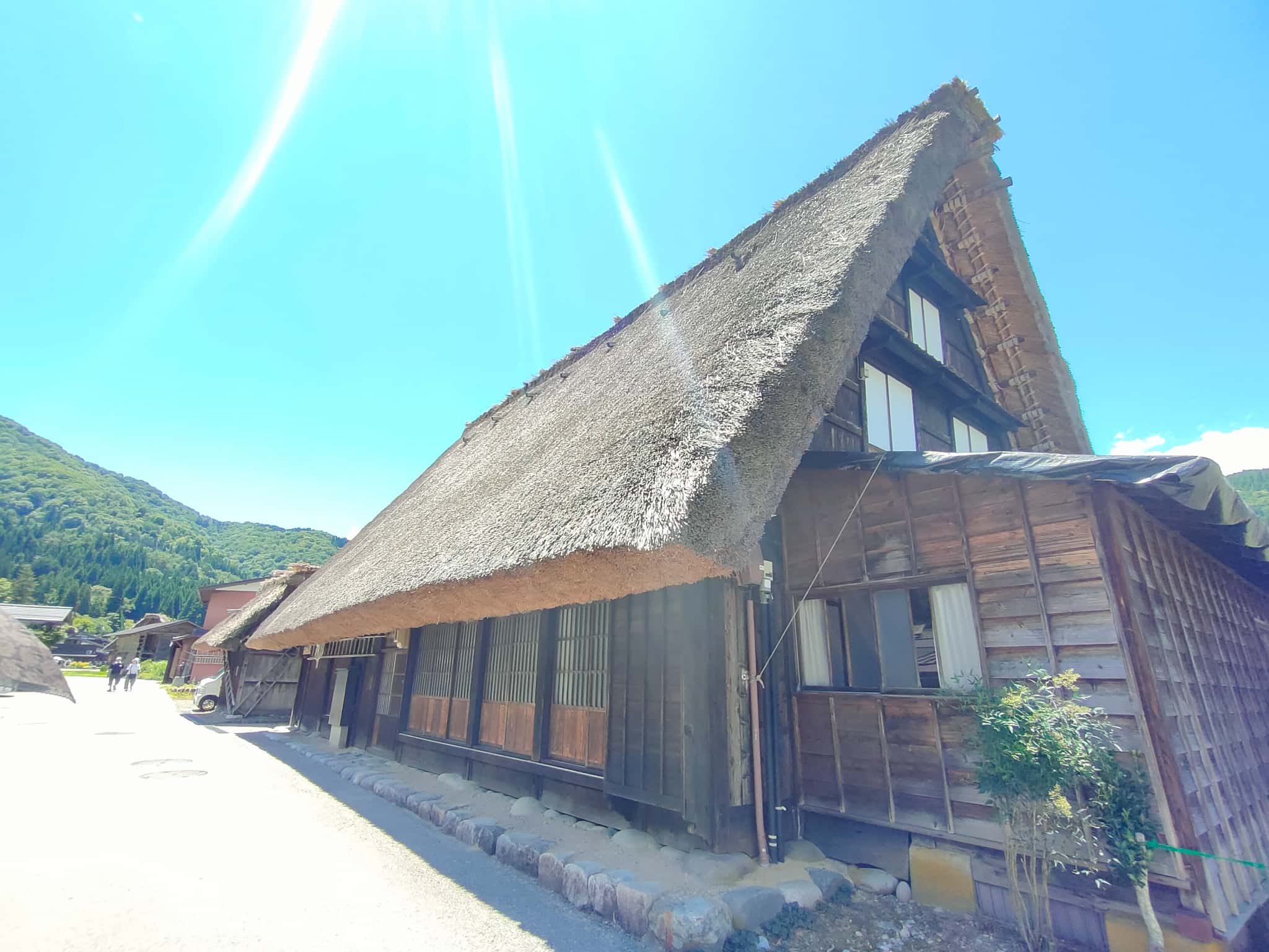 さて、荘川で降りてそのまま北進して白川郷へ。今回の目的は、合掌造りの建物を見るというより、その建物と周辺環境の「見え方」です。というわけで、白川郷ですw 「村営せせらぎ公園駐車場」は無料駐車場で、朝早い時間ならワンチャンいけるかなと思ったのですが、なんか工事をしているようで、観光バスやバイクのみの駐車が可能で、普通車などは、「寺尾臨時駐車場」や「みだしま公園臨時駐車場」に停めることになるのですが、これ結構、距離があるんで炎天下の元で歩くってのは結構厳しいですw