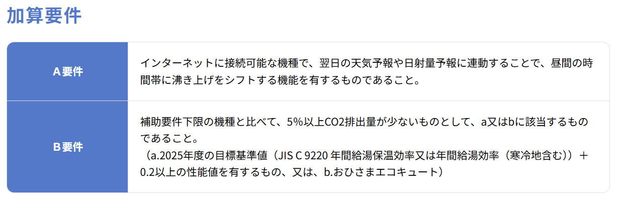 具体的に言いますと、A要件では、インターネットに接続可能なリモコンで、アプリなどを利用しての機能が使えるものですし、B要件では、効率の良いものの選択という感じで、ほぼ一般的に使われるエコキュートであれば要件を満たしています。