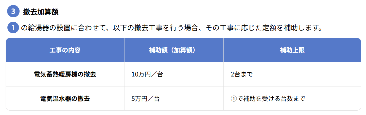 撤去加算としては、電気温水器の場合、5万円/台です。
