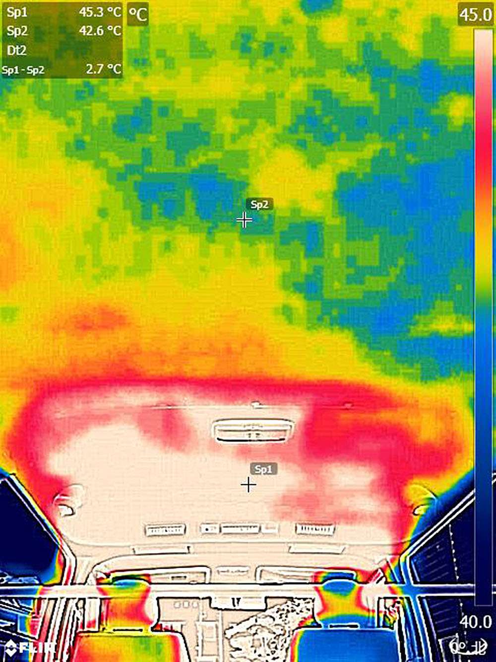 接着にはスプレー式ボンドを使用しました。施工後の様子をサーモカメラで撮影してみました。結果的には最大で2.7℃の温度差でした。やはり、車の構造上SDN-SHEETと天井外板との間に通気層を