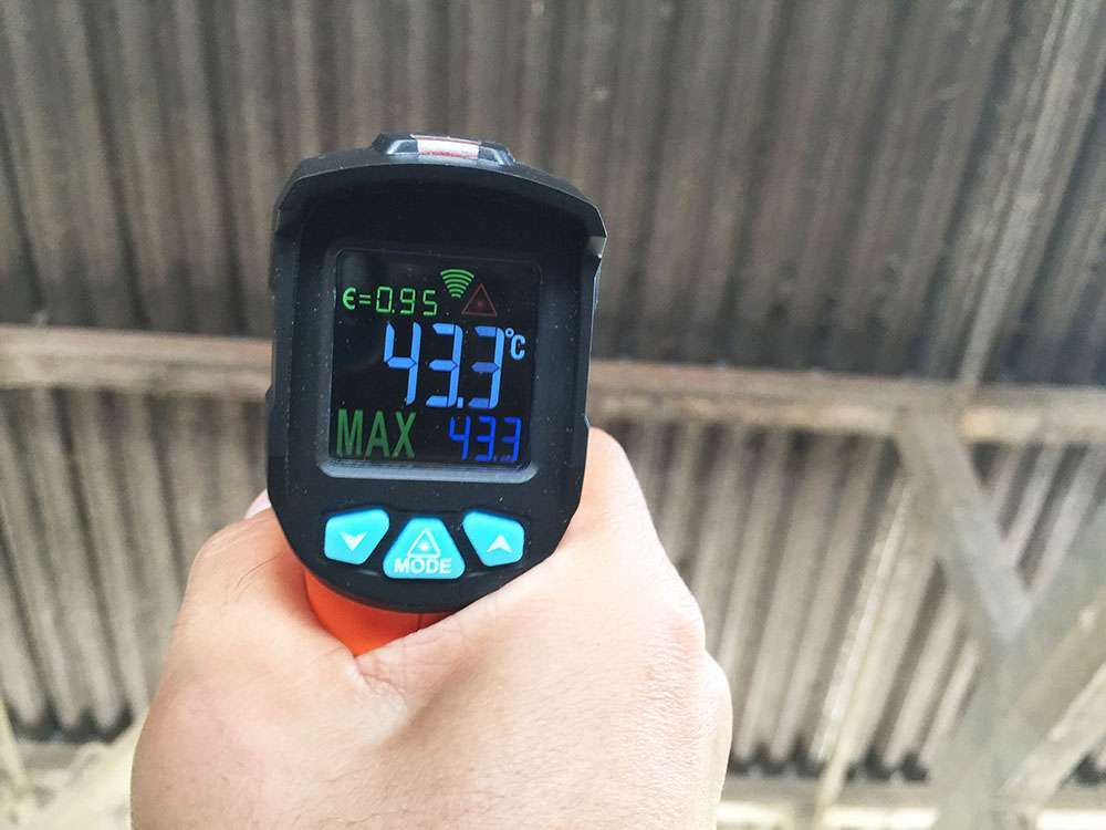 今回は神奈川県の酪農家さんの牛舎への施工報告を頂きました。簡単ですが、SDN-SHEET施工の様子とSDN-SHEETの未施工部分と施工部分の屋根面の温度測定を行った様子です。涼しくなったと言っても、快晴の時は簡単に40℃以上になります。