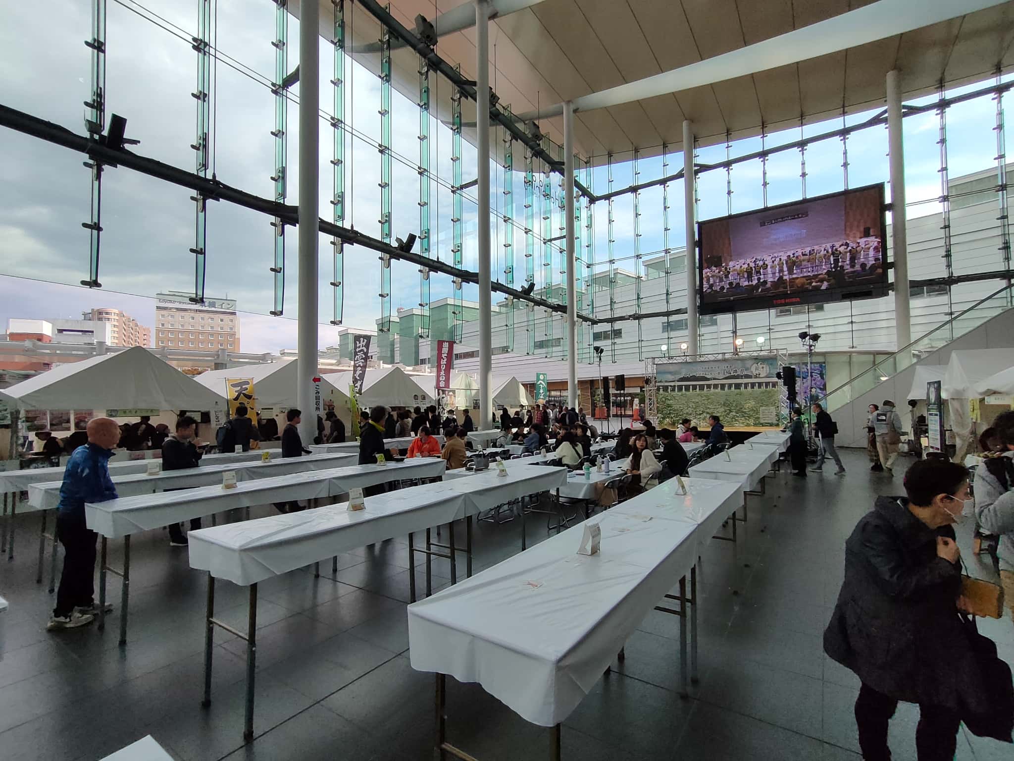 出店はハピテラスで行われてますが、この日、ちょうどハピリンホールでは、「第三十回全日本素人そば打ち名人大会」の開会式が行われていました。全国からそば打ち名人たる方が集結し、腕を競うわけです。さて、そばの出店はそばが無くなれば閉店ですし、後から続々とお客さんがきますので、とっととめあてのそばを食べることにしましたw 朝いちばんですので、それほど待たずにゲットできましたw