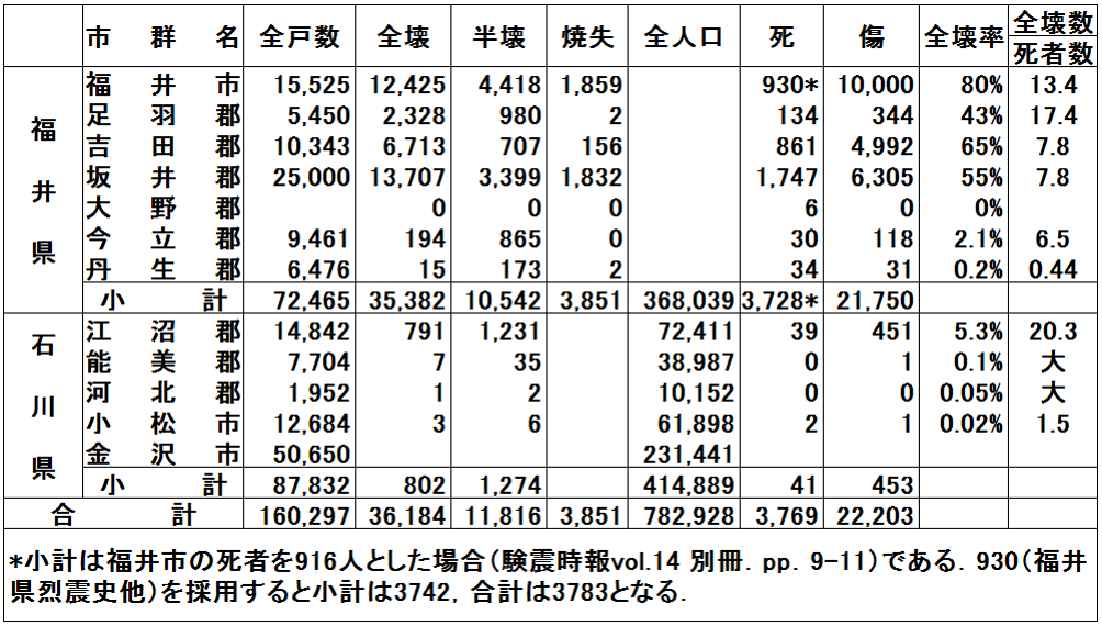 小学校の教員の方が残念なことに震災により亡くなられたことなど、生々しい記録の記載がありました。福井地震の被害状況は、以下の通りです。