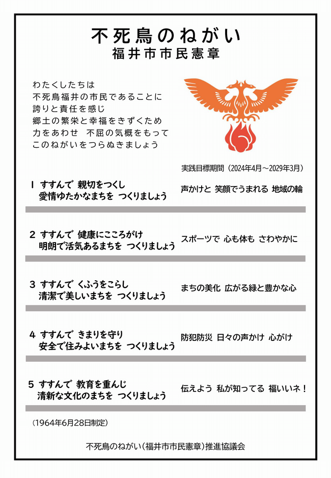 それでも、空襲、地震、水害と立て続けに不幸に見舞われても、福井市は復興を成し遂げてきました。まさに、不死鳥のようによみがえってきたわけですが、このことにより、福井市では、「福井市市民憲章 不死鳥のねがい」というものを掲げています。