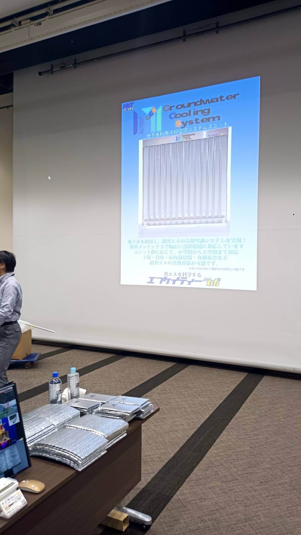 今回、SDN-SHEET🄬だけではなく、井水利用のGCS(Groundwater Cooling System)もご紹介しております。ホントは展示システムをもっていきたかったのですが、沖縄までの空輸となるとコストも結構かかるので残念ながら持っていけませんでした。ですが、会場ではプロジェクターでGCSの紹介をしていただけたようです!感謝感激です!沖縄は畜産の盛んな地域ですので、酷暑への対応ということでお役に立てれば幸いです。