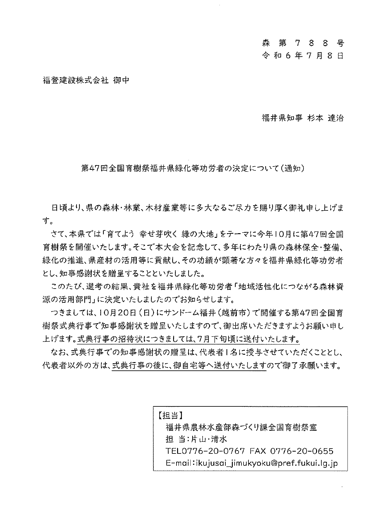 さて、弊社は、この度、「第47回全国育樹祭福井県緑化等功労者」として表彰される旨の通知を受けました。以前、県産材関係での表彰をお受けいたしましたが、それに引き続きの名誉を賜ることになりました。