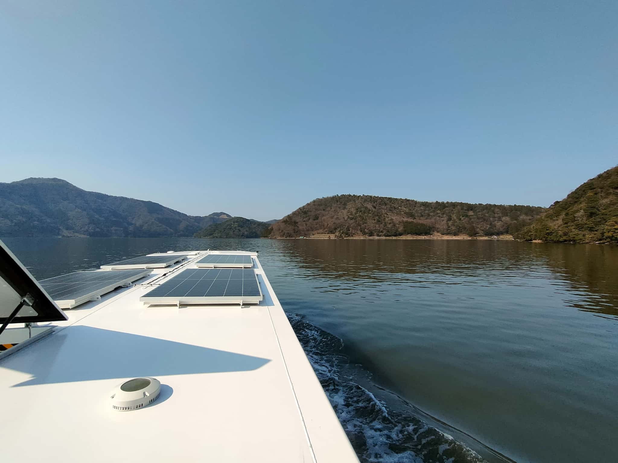 さて、この美浜町レイクセンターで運行している遊覧船は、ちょっと変わっているところがあります。それは、「再生可能エネルギーで航行する電池推進遊覧船」なのです。船の屋根には太陽光パネルも搭載されていますが、レイクセンターの施設の屋根にも太陽光パネルが設置され、遊覧船が岸につくと充電するような仕組みになっていようです。